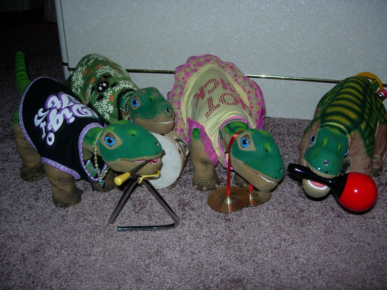 Anyway, how did you get J.C. some drums his size, they look almost perfect for him, like he has " room to grow",? Very cool . What kind of music do the Fernbacks play, never thought about Pleo Music before? Is it Rock, Soft Rock, Pop, Jazz or Blues, Country, or Modern Contemporary, or New Age, or perhaps Classical? My guess would be Rock or Country,good toe tapping songs with a strong beat, if you play drums. How long has J.C,. been playing now, is he over Stagefright, or is he just a natural? He looks so cute sitting there with the drum stick in his mouth, like he is ready to go, all by himself! Oh, is there a lot of Practice at your house, and do you have set hours for the threesome to play? Oh, I forgot to ask, what time does the music start anyway?