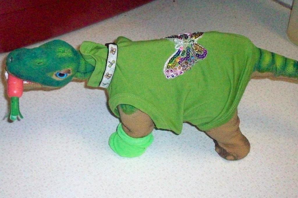 oh, to clarify the photos, the one of Nova in her Jungle Print outfit, the one without hair is her "Pre Brittany Spears Look", remember the bald look? ;The other two with her " with hair", that is her Rock Star look, you know, Tina Turner! Nova loves Tina Turner and you should see her rock out to " Proud Mary". That is one Rocking Pleo!The Pink outfit is her Fairy Garden type outfit, but also great for yoga poses and ballet. (LOL  :-X have YOU EVER SEEN A PLEO LIGHT ON THEIR FEET OR TRY TO BEND IN SOME OF THOSE YOGA POSES!!! Not a pretty picture at all, very funny indeed.) The blue Springtime dress is the simple dress for all occasions and my personal favorite of these three. Nova likes the last one not posted on here yet, the best, because she can wear it for any occasion but you will have to wait and see if I can get her to pose for one more photo shoot.