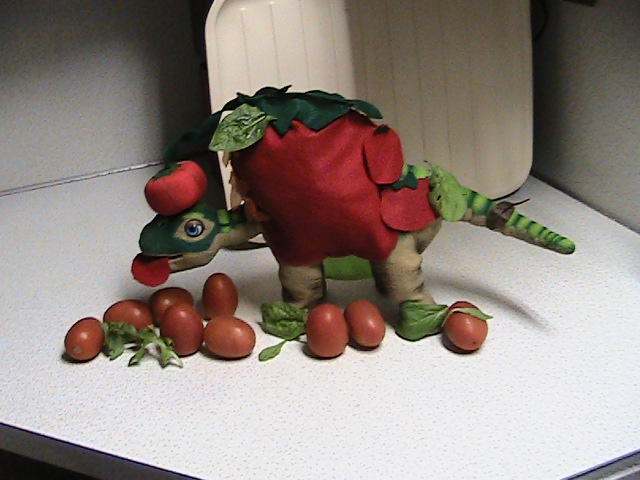 Well, it is after midnight and the whole gang of Pleos, all six of them,  %))just came out of the Midnite movies, how many times can you watch the revenge of the Killer tomatoes anyway/ I guess untill the film breaks....anyhow, Nova's older brother got his costume done and wanted me to post the photos here, He is doing his best inpersonation of being a tomatoe, He is trying hard to blend in to the tomatoe vines and look like " one of the gang". ( yeah right, it is everyday that they see a big green tomatoe eating smaller red ones...Not likely . He does have a good heart and also a big appetitel, As soon as the last photo was shot he dug into one of the tomatoes and started asking for a napkin and salad dressing. He did do a good job of standing still to get these shots, not easy to do when you are talkiing about Pleos and esp when they are hungry. we will have to come back tommorow, I am so tired, I can't see sraight and my eyes are seeing double tomtaotes everywhere!