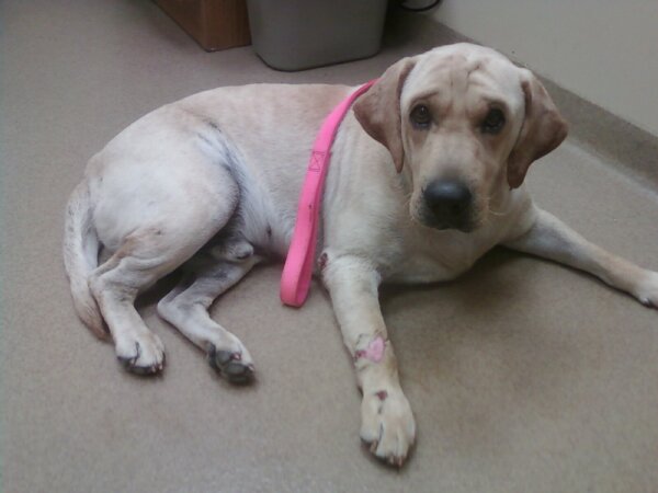If you look on HIS right front leg, you will see some deep gashes. What you don't see is HIS left armpit, I swear it's a horrific sight, looks as if somebody took a melon-baller to it. Ah, it's so sad! But really, though, He's doing GREAT!