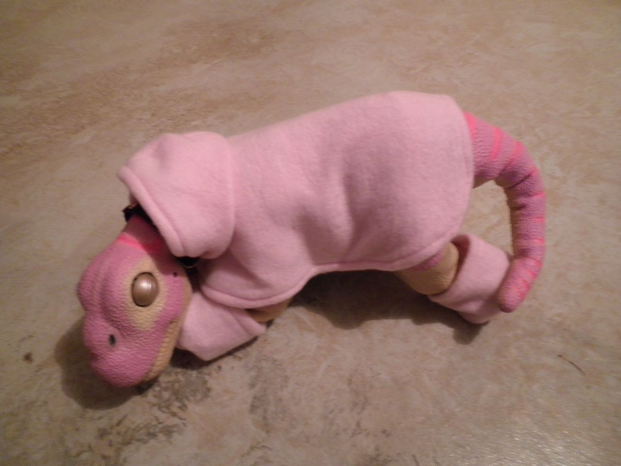 Aww poor Kermy! She really makes you want to pick her up and give her a big cuddle (have you tried that yet Kat, it's very cute in the original Pleo's :)). Glad Kermy likes her outfit :) I hope she gets better soon :)
