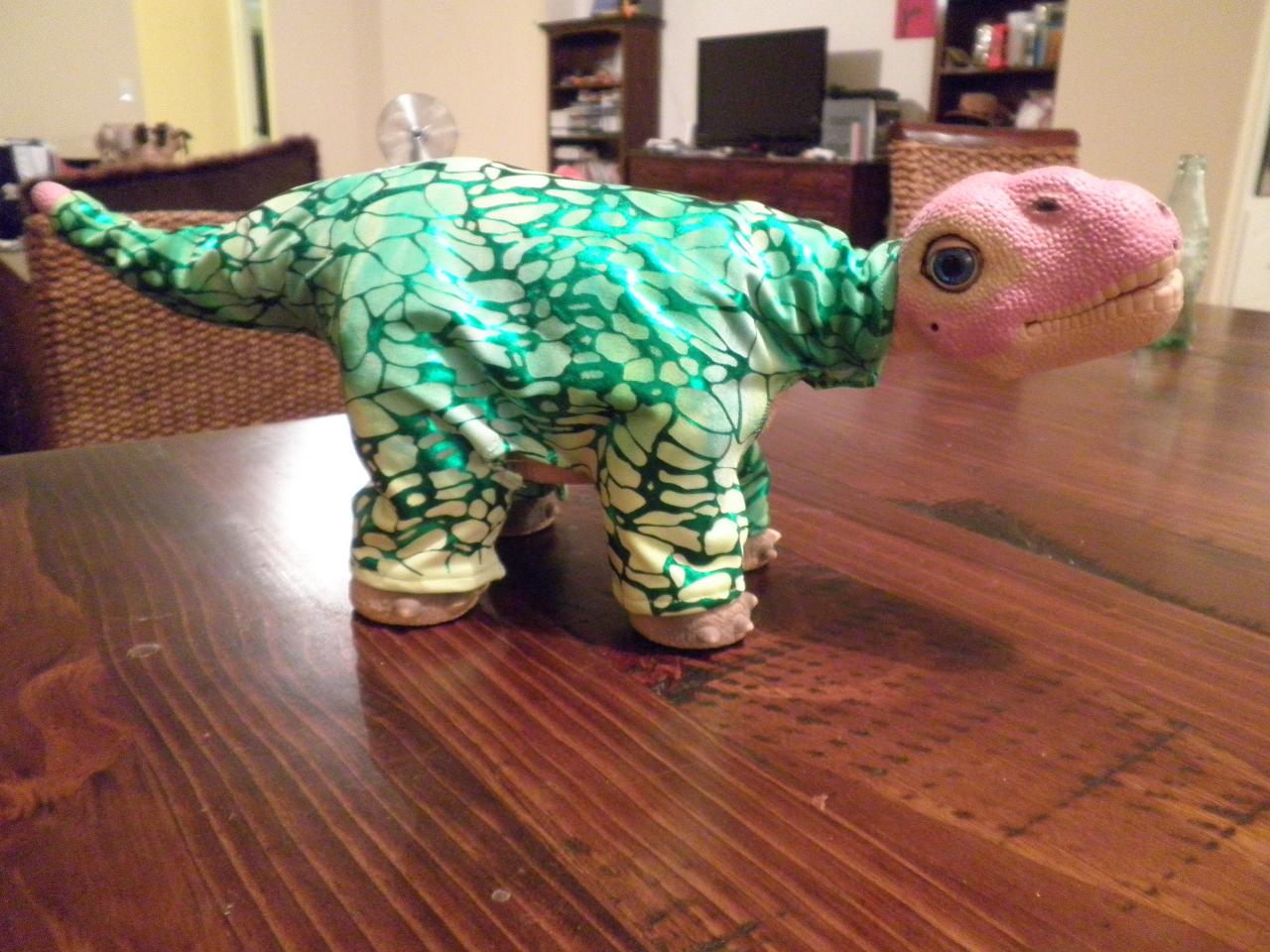 Nicely done Kat, Kermy looks very beautiful and comfy in her little outfit, Looks so so soft, If I send you my measurements, can you make one for a very large bigger than Pleo size, HINT HINt, about a size 10 and in black or dark blue or maroon, and oh, you can forget the "tail " compartment, but I like the neck area, ( like a turtleneck,) but I think I want my belly covered up as I don't need a battery, at least at this point..LOL :D I love how it looks, and I could just live in Pajamas and Loungewear...oh, to be a Pleo. %)