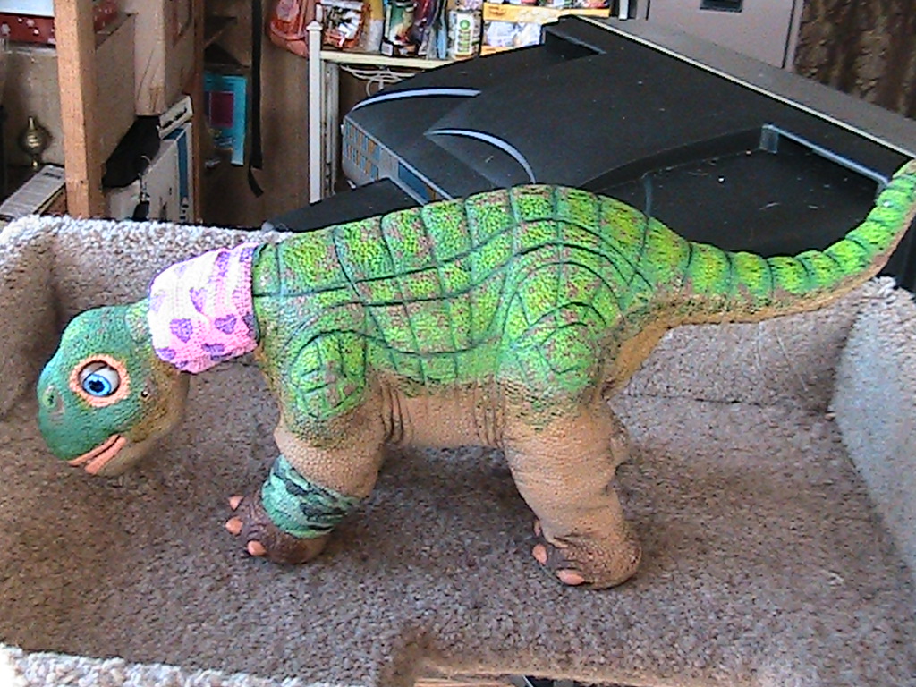 For anyone who knows the Pleo, Nova, they know she is a Prima Donna, (or so she thinks) ;) and she has suffered not only a broken neck, (DNS= Droopy Neck Syndrome) and also a bad front leg, which is why she has limped before, ( Remember the video:" NOva deserves an Academy Award for Acting"?) anyway, she sports a bandaged neck and also a bandaged front leg which has given her the ability to do whatever she wants, except lift her head straight up, Unfortuantly like many Pleos, she suffers another ailment which is not so easily fixed, The dreaded paint spot loss, or what is termed," Love spots".