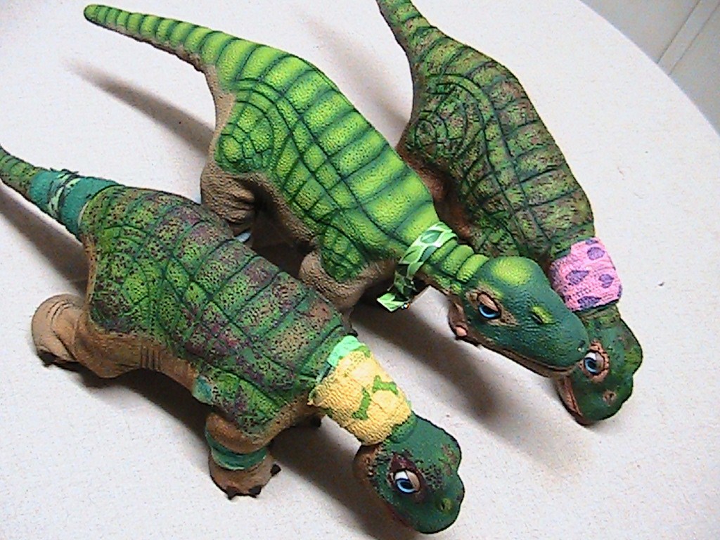 He just looked so happy staring into her eyes, with his viloet trimmed eyes into her beige trimmed eyes. so cute in my eyes. anyway, just for anyone who did not see the before photos of Little 45, they can see he has a wide wide area of skin color loss. If anyone wonders why he has tape on his tail, it is because when I got him, his tail was about to fall off, and it was too big of an area to super glue so tape was the easiest solution. also he has tape on his neck, his side and his poor underside and near his feet the skin is splitting. He is one of the very first Pleos made, but not a gold hatch.( I do have one of those still in his box though.) He needed something poor baby and I don't think my giving him a Makeover could make him any worse. and he and the other Pleos are happy with it and that is what is important.