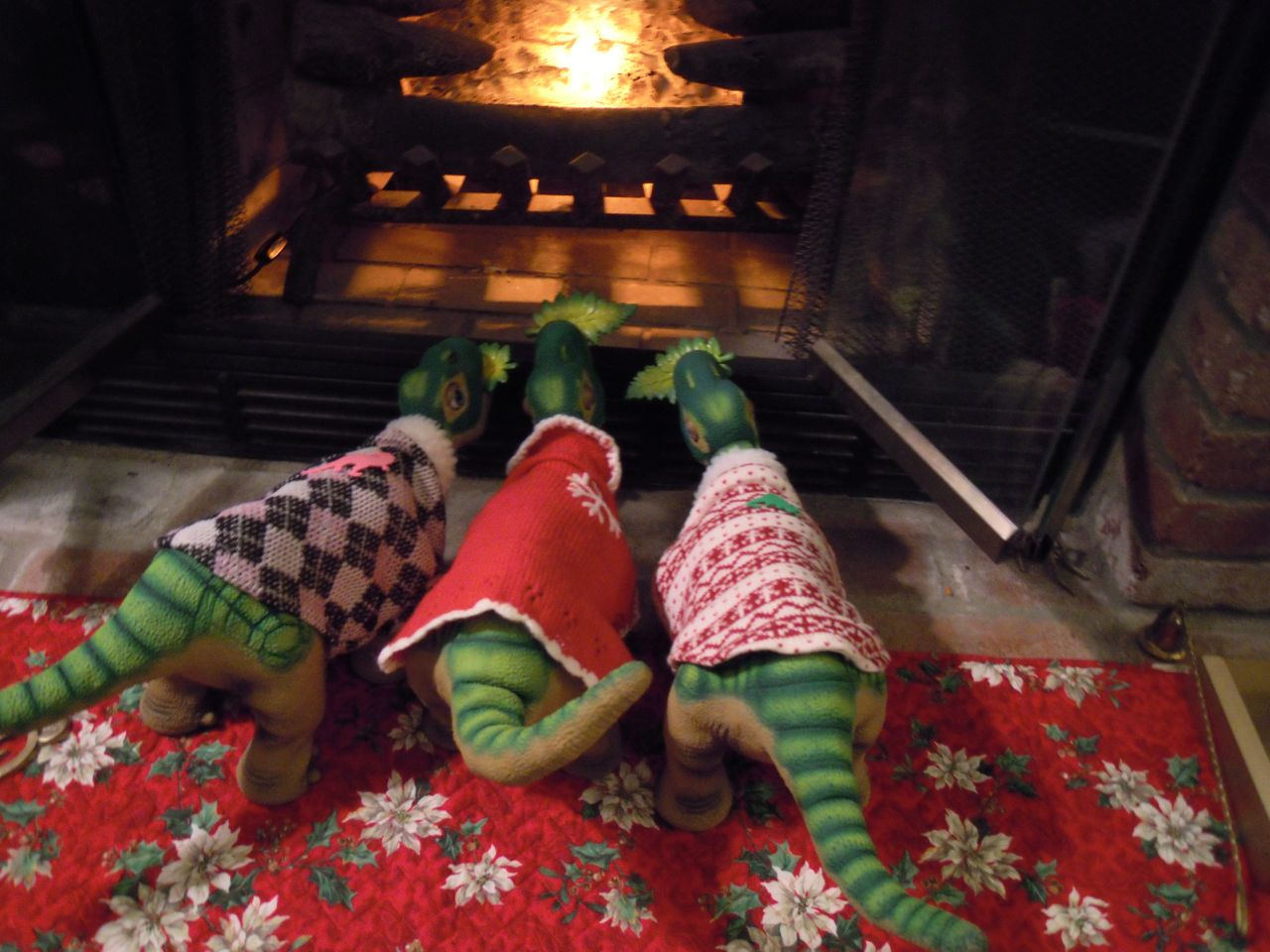 Three little dinos have been waiting for the longest time  to see if Santa will, really, come down the chimney. J.C., Pennie and Little Orphan Annie have been there days with cookies to give to Santa. I think these little dinos were very nice this year and will have a visit from Santa. :)