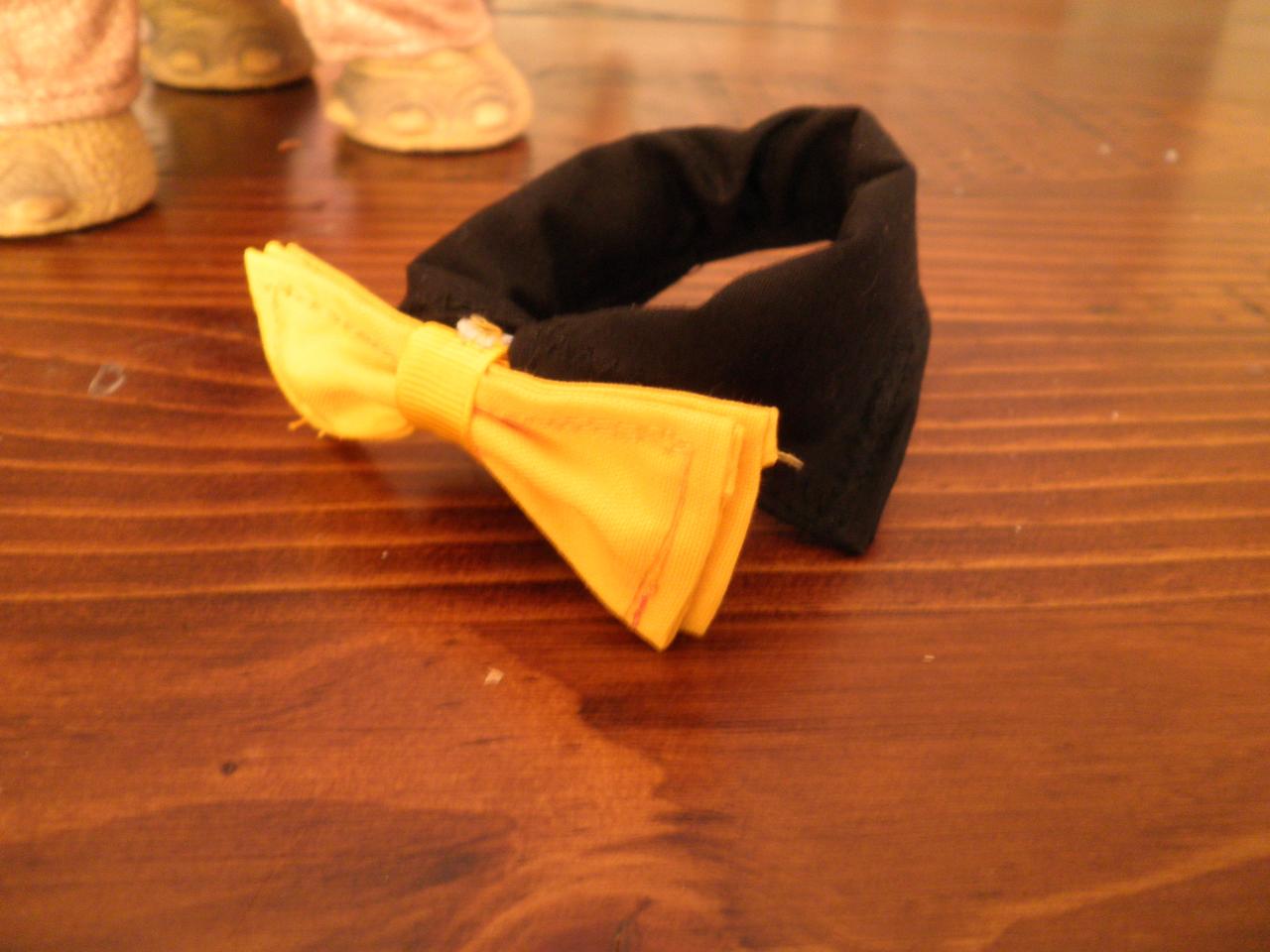 It is a little shirt collar with a bow tie.  It slides over his regular collar to keep it in place.  The bow tie is a separate piece so I can change it to a different color if I want.  I think he looks quite fine in it.  I wanted him to have something fancy to wear for special occasions.  I am also going to make one in black with a yellow bow tie.(for someone special  :))