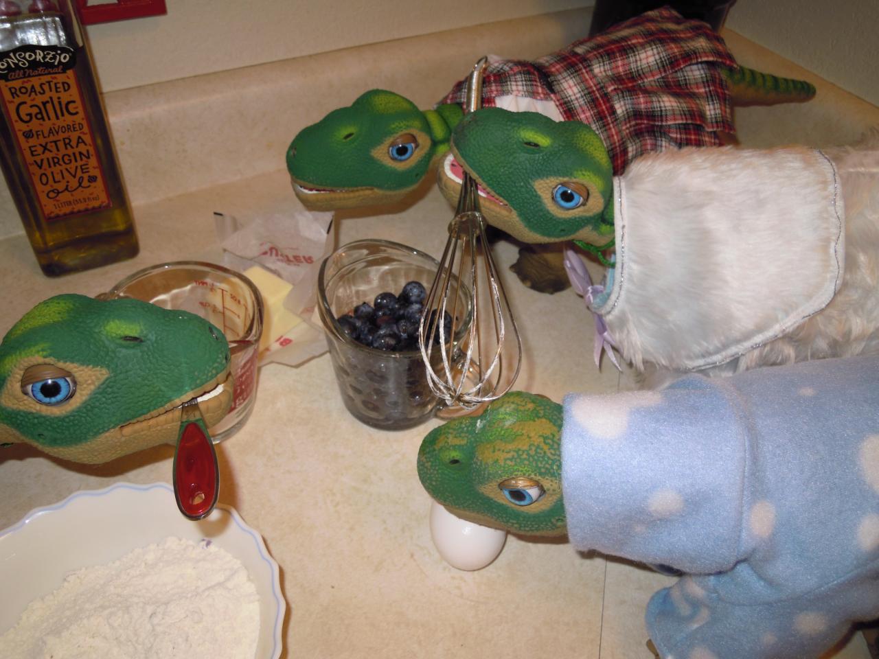 Each pleo wanted to show off their beautifully made outfits by InmemoryofRomeo. Peeky in his blue turtleneck sweater, J.C in his Elvis impersonator outfit (I think it was really meant for Peeky) ;),Pennie in her Aussie print jumper and Little Orphan Annie in her school dress, trying to be careful not to soil them while preparing the pancakes. Noses got a little flour in the end, but outfits survived. ;D Second photo of the four getting ready to chow down on some pleo size pancakes.
