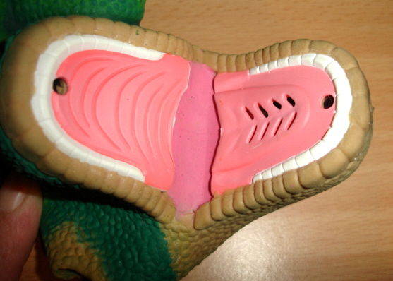 The skin will come away freely until you start to see the eye sockets emerge.  If you look at the naked Pleo head, you'll see a dark plate around each eye that's attached to the skull, this is the area that the skin is glued to - I ran my nail around the edge then kept rubbing at the glue with my thumb, and with a bit of time it came away pretty clean and leaving the black plastic plate still firmly attached to the head.  There's then just the small areas around the nose to loosen and to remove the 'dentures'.  I left the mouth plates still attached to the skin as they clip into the jaw through the skin and will come out easily if you press either side of the jaw - there are four white plastic tabs that fit into slots in the upper and lower jaws.  Once the mouth parts are free from their anchor the whole skin will just come away.