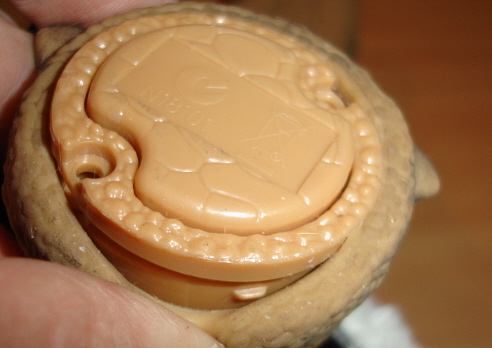 When you've loosened the skin around the battery area and the SD card slot, the next stage is the back feet.  You need to first remove the two screws that fix the footplate, and once that is loose run your nail around the inside edge so you can remove the footplate altogether.  The skin is also glued to a round white plastic ring that holds it tight at the base of the leg, held in place by four moulded ridges.  You dont need to unglue the skin from the ring (although the previous owner had removed one, so I can show you how it fits on in the pic below) - once the skin on the sole is free all around the edge, you can push the ring down over the foot and then just pull down and stretch the skin to free the leg, pulling the edge over so that the leg is now coming out of the hole for the battery slot.  After all the discussions on skin wear, I was totally amazed at how strong and resilient the skin actually is!  Repeat the same process for the other back leg.  Scully's previous owner had made two small 1cm slits in the skin, one each side of the battery compartment, which did give me more room at this stage, but I don't actually think it was necessary - I think the skin can probably take it.