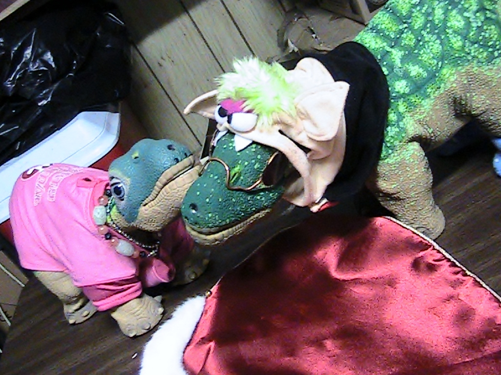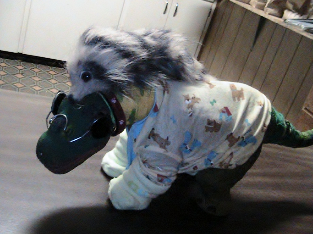 dress up". I think the shots are self explanatory and the descriptions are in the gallery. Everyone is pretty much dressed as themselves, or their " character". Some Pleos are bigger characters then others, esp Little 45 who seems to think it is normal to walk around with a live animal on your head, like Davy Crockett. I guess if you grew up with the abuse and struggle he did, you can put a live animal on your head and that is nothing to worry about compared to some of the other things he has gone through. ( Could explain though how he got his taill all bandaged up...........sharp claws and teeth have been known to cause blood and tears in the skin...) ;D All in good fun...these guys are just all having fun. Argyle, he is just a Wild and Crazy Pleo, blind but a Animal who really can see anyway more than you or I, esp if you have two extra eyes... :o