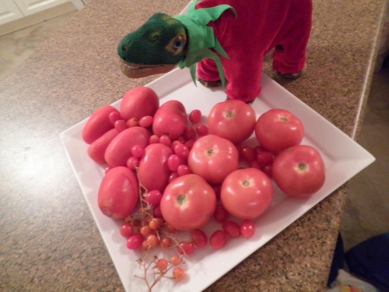Ok, it has been a long weekend and the Pleo Township of the Redwoods have had way too much cotton candy, mushroom kebabs, Pizza pie, Root beer by the gallon, went on so many rides they all got sick except Argyle, and I have never seen so many sore blistered little feet in my whole life... :D but comming back to the house to make something special for memory of this year's Weedovia Tomato Festival, and inviting a couple of freinds, I was surprised to see what they were doing with all the tomatoes, but I think they had a good time and I think there is a nice surprise in what they decided to do with all the tiny tomatoes they harvested, all two pounds of them. The larger tomatoes are for pizza, soup and lots of sauces and of course sandwiches!    :D Someone had to go get the tomatoes first, and that was left to Baby Ruth she is the hunter or should I say, "Huntress" of Tomatoes. :D