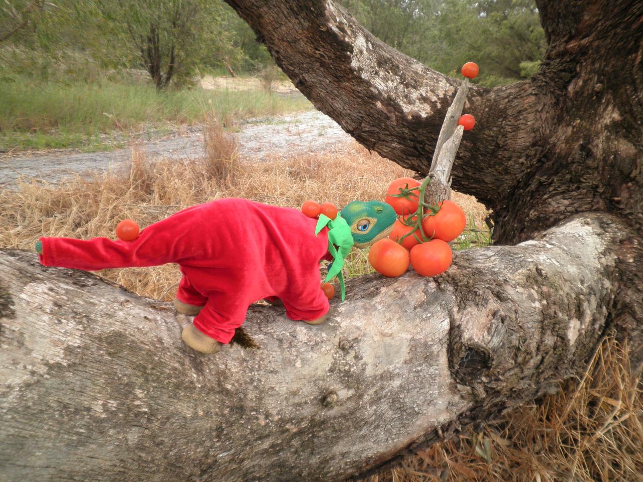 Minyon bravely climbed the great tomato tree, capturing tomatoes as he went.