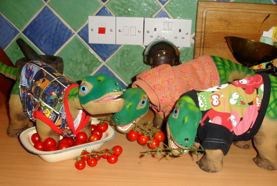 THis is a photo I dug up from before. Four little dinos head deep in tomatoes in an antique grape press. ;D