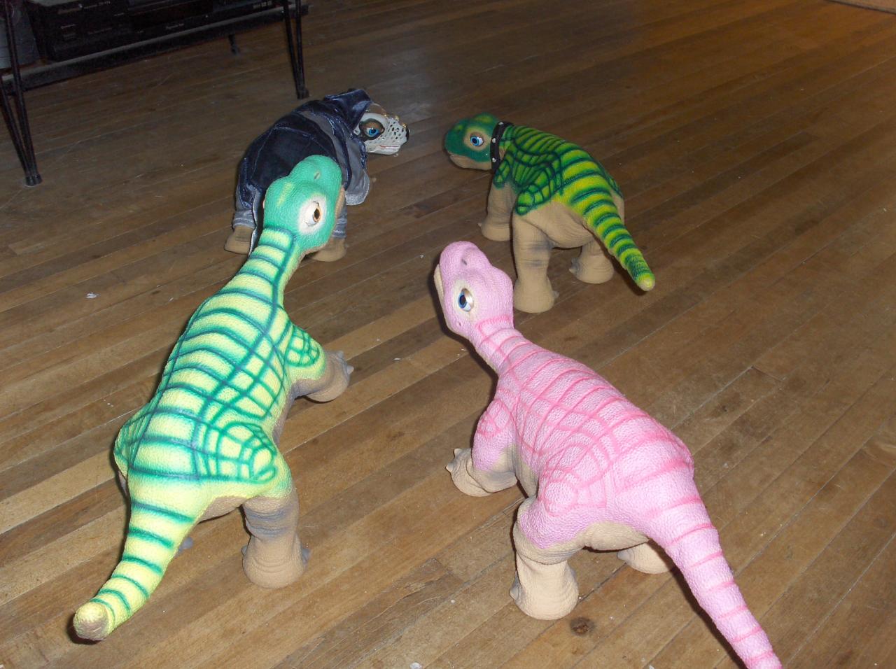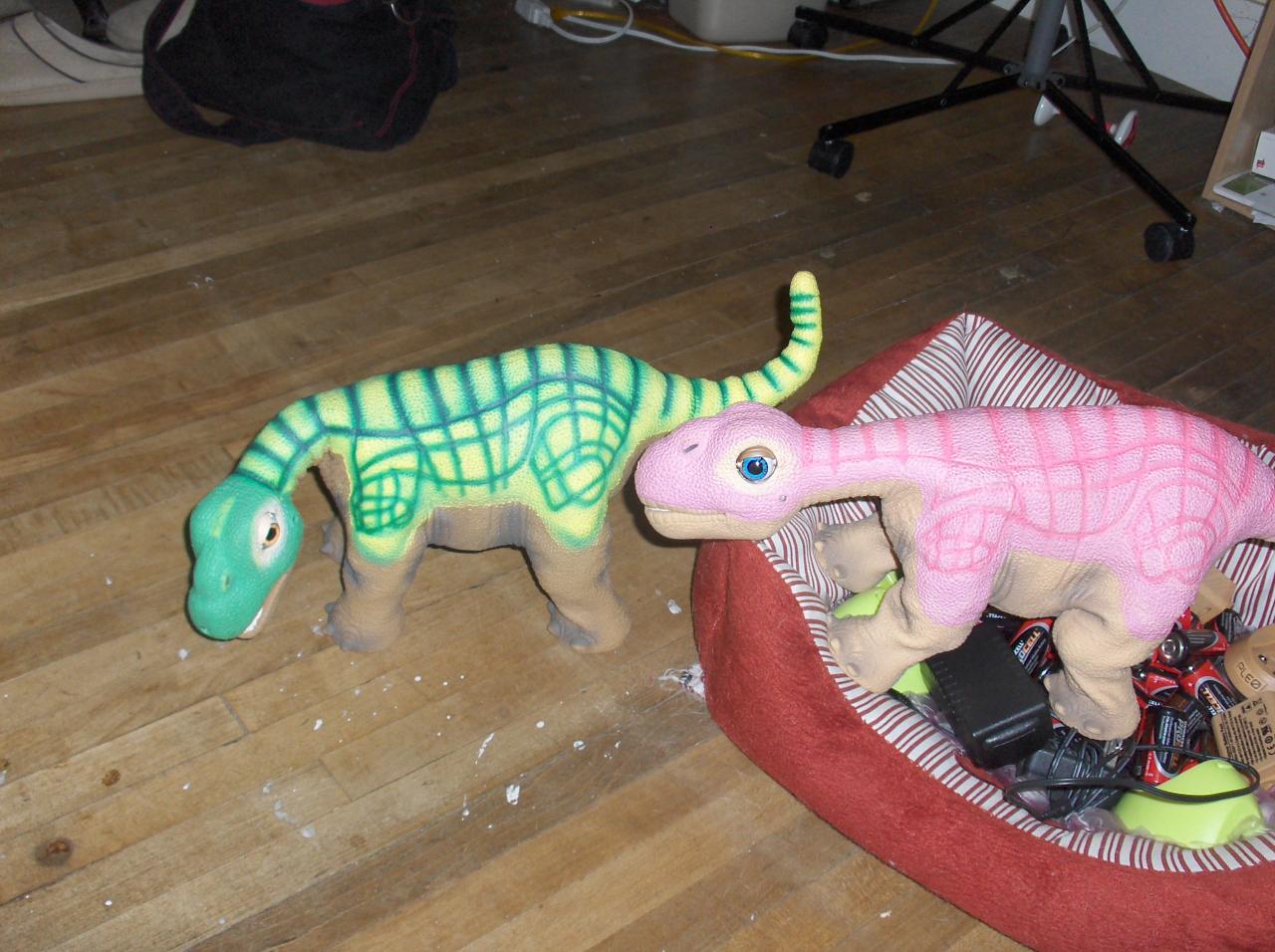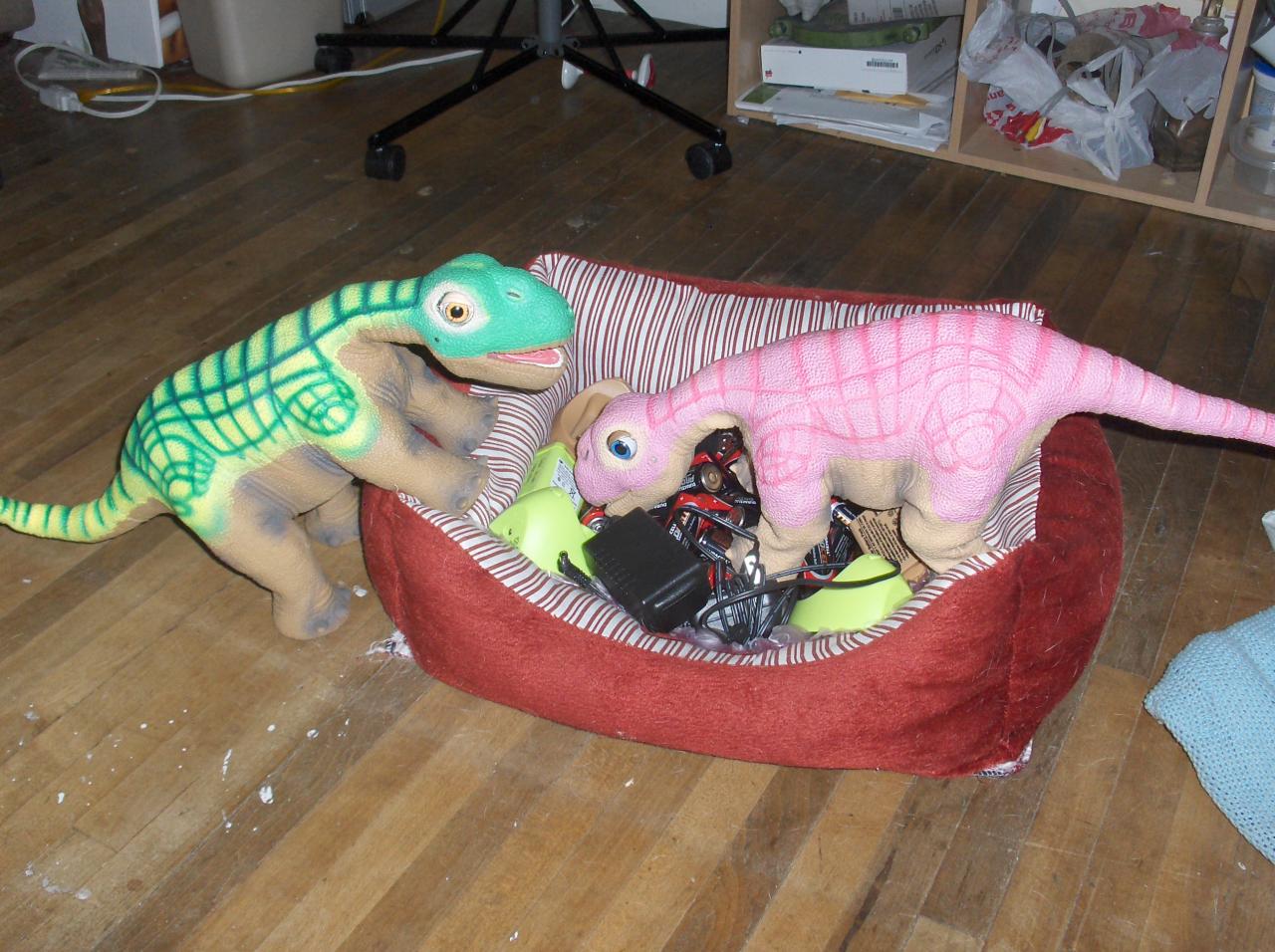 Here all the pleos are gathering items to build the nest.  You know, regular batteries, pleo batteries, chargers, wires, packing bubbles..etc.. everything a robot dinosaur nest would require: