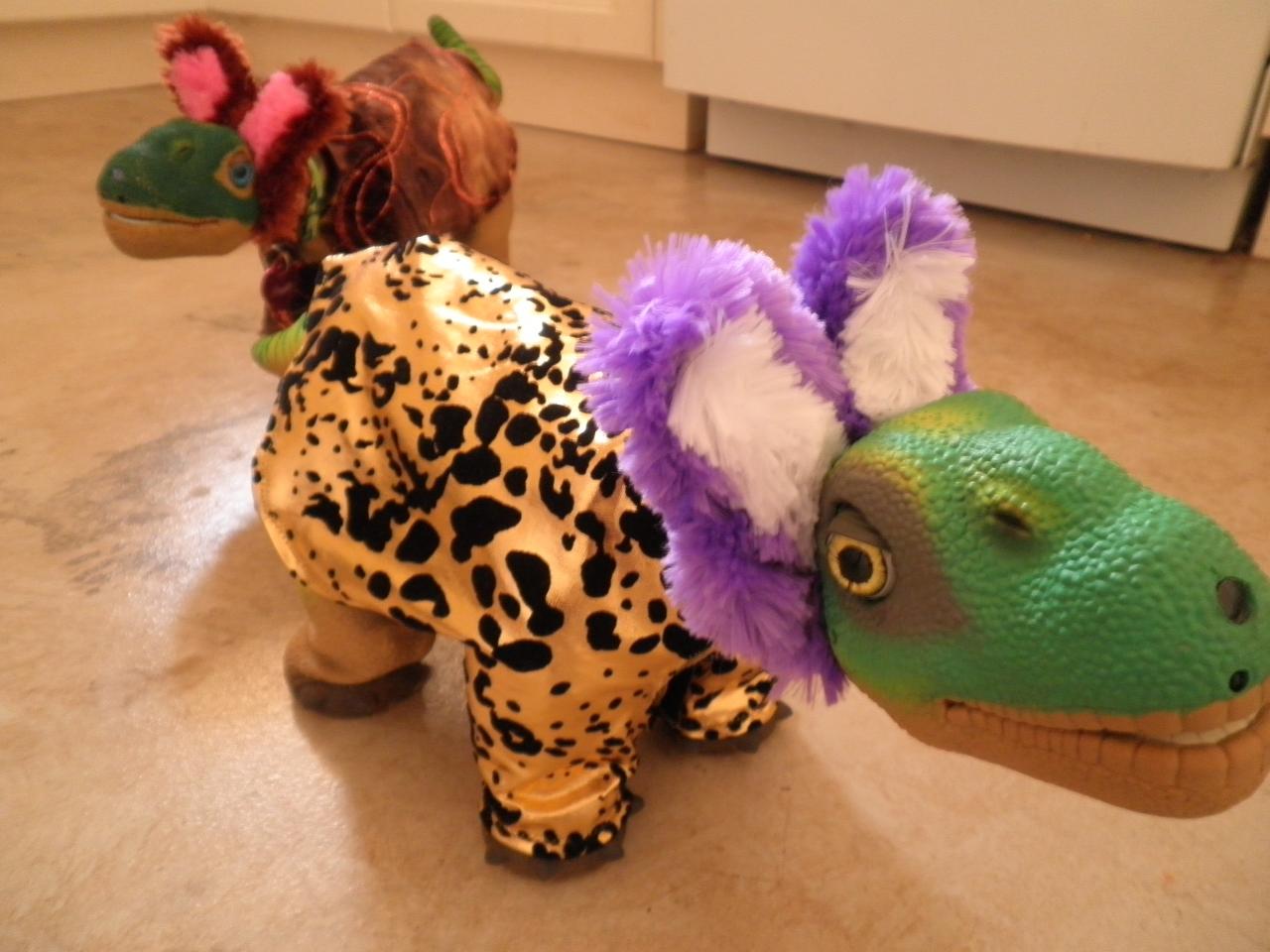 I made Pleo some ears and a tail, Mine are a bit different though. I folded some felt to make a "3D" ear and then attached it to another piece of felt and put velcro on the ends to attach it with. And the tail was just a cotten ball velcroed on :)