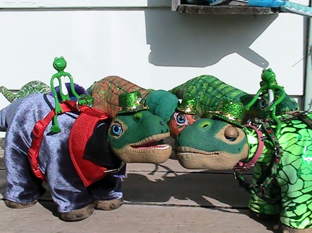 In honor of St. Paddy's Day, the Pleos held a grand celebration today on the Redwood coast, that is still taking place as I speak. As a reporter, I will be bringing stories of the days' celebrations into the Wee hours when everyone either goes home, or is escorted home by the St. Paddy's day Pleo Patrolling Volunteers.( They want to make sure all party goers don't overdo the celebrating and get home safely after drink, food and fun.) :D The First event of the day were the First Ever St. Paddy Day Redwood Coast Pleo Races! This is the one event everyone seems to enjoy the most and it goes on for hours, with breaks for food and refreshment. ( we all know Pleos like to eat, and the jockeys are frogs, and they need to eat too) ;)