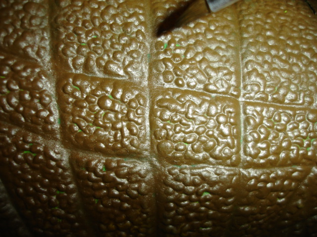 Having applied most of the colour with the sponge, spreading out the paint as much as possible because I want to keep the texture of Pleo's skin as sharp as I can so try to keep the layers thin, I did the edges with a small round brush, then got Pleo to put his head down and to the left.  This opened up all the cracks on the neck so I went over them with a fine brush, using the point to push the colour right into the cracks, then when the brush was less loaded using it to blot away any pooling and spread it.  I then went carefully over the rest of the skin to fill in any little spots that might have been missed.  The I did the same with the head down and right, then repeated the procedure with the tail.  You don't need to do it with the head and tail up, unless you are painting the underside as well.