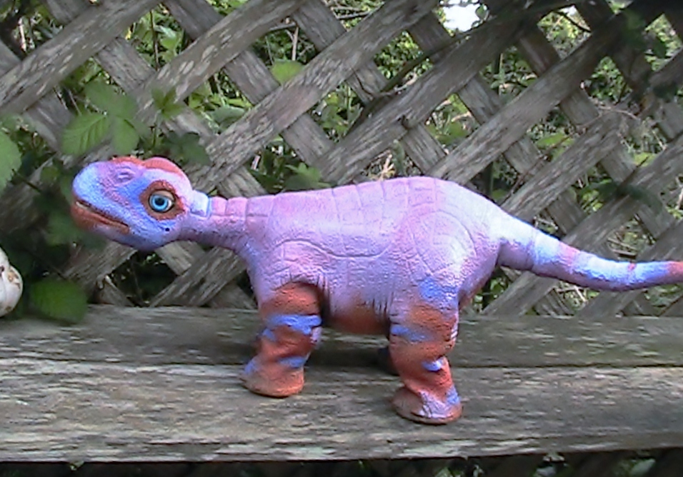 Ok guys, I have been going over and over the colors on this one and took three different paints done again and again till I was satisfied. It is not going to look like your timid Lavendar Pleo it started out as, but more of what I think they may have looked like, It is more colorful than you may  have thought and some of you wanted colorful, so here it is, I could do drab browns oranges and etc that all blend in, but this is lavendar shades, blues with other colors and I wanted to surprise and I am sure I did, I could have played it safe, painting following the lines and left it a simple lavendar, kept the beige legs etc, and just did the eyes, but anyone could do that if they want, and I like to use my imagination. What I did do though was use Acrylic paints mixed with other things and also has a protective coating, is waterproof, no color comming off on the washcloth and is very flexible, can move well and no cracking etc. I have the first photo just to see the under coat before I did the rest of the colors and with a couple of painted friends, for comparison. Thanks for putting up with my Painting moments of Pleo Madness... ;D :D
