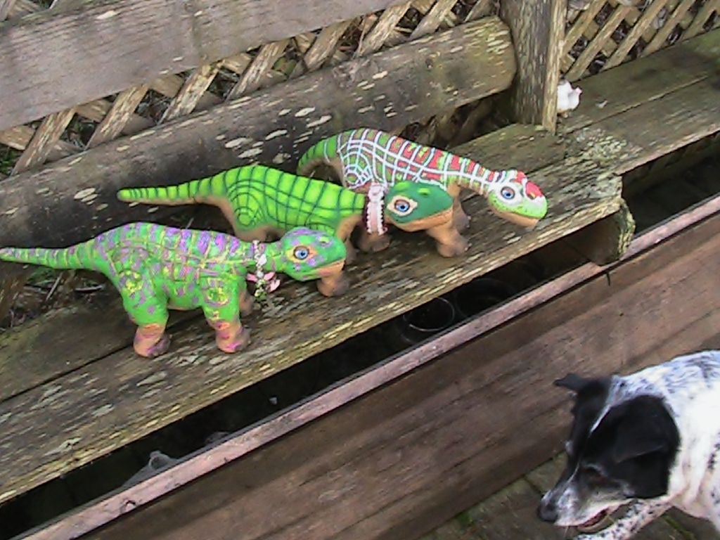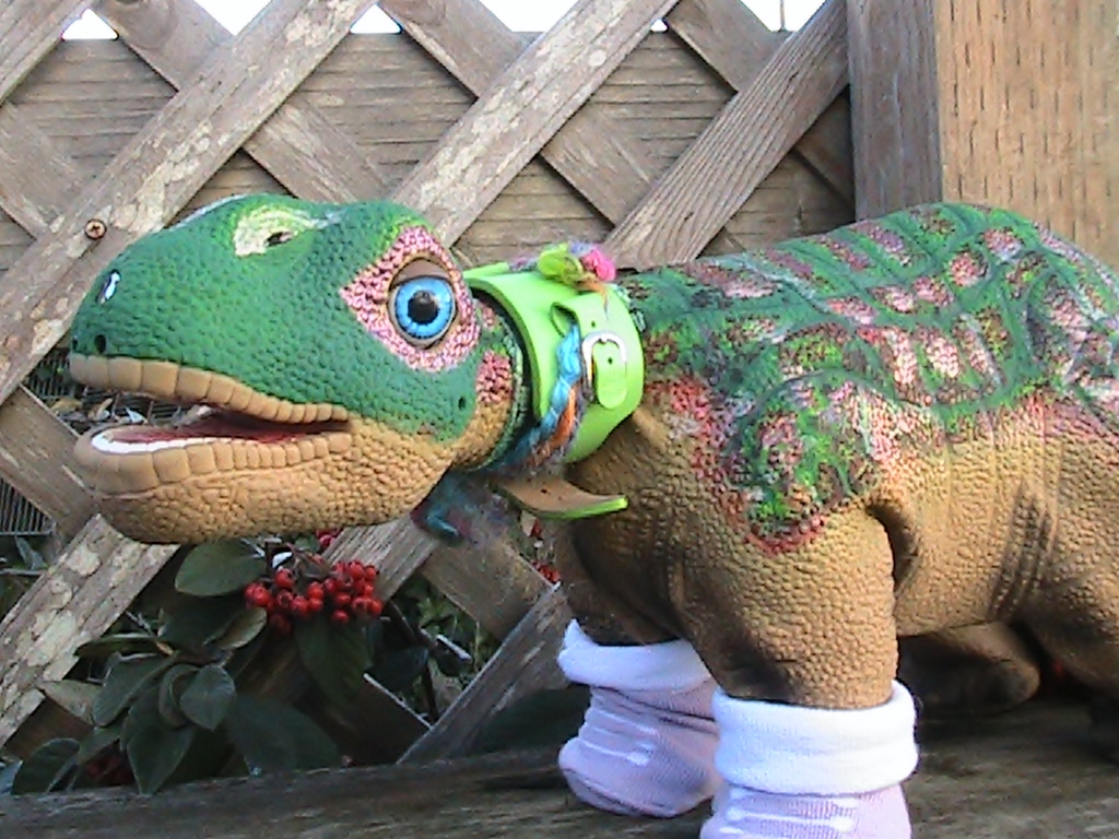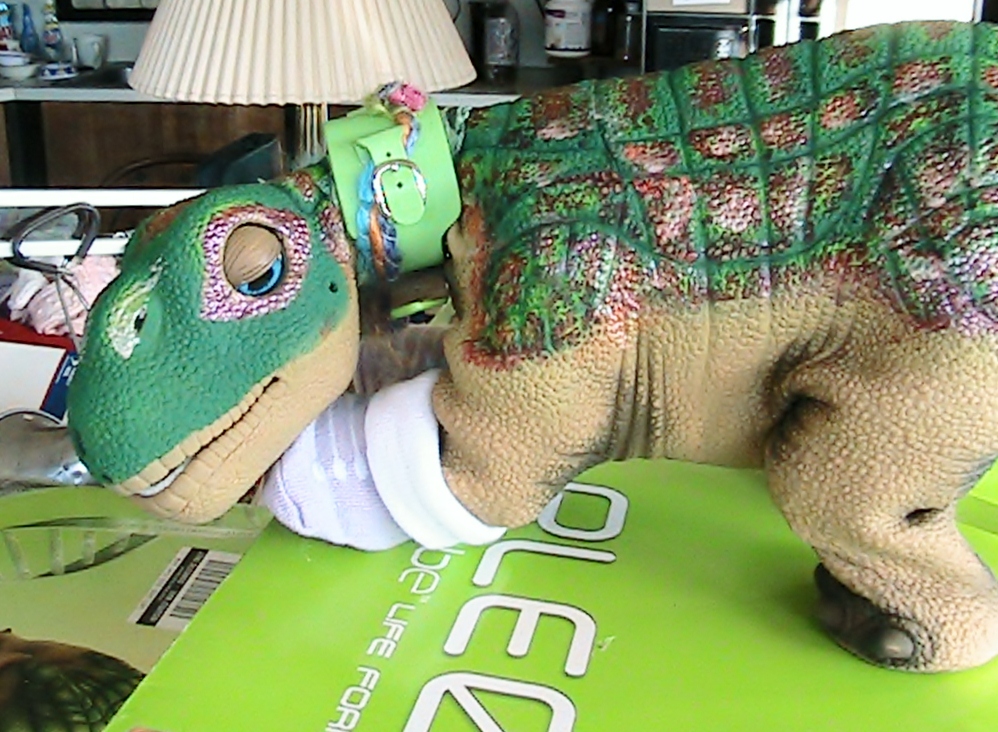 This Pleo is unaware of what is going on but the other Pleos have noticed the new "salon makeover" and are giving her a good once over this morning so I thought it only appropriate to take some photos of the new look, and also great mug shots if the Pleo Painter needs to be prosecuted, I will have some good evidence of the "crime'.  :D