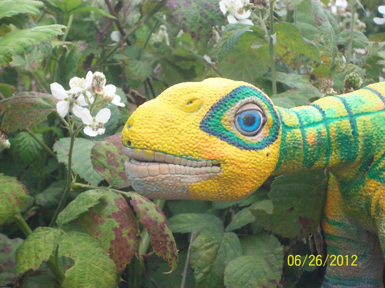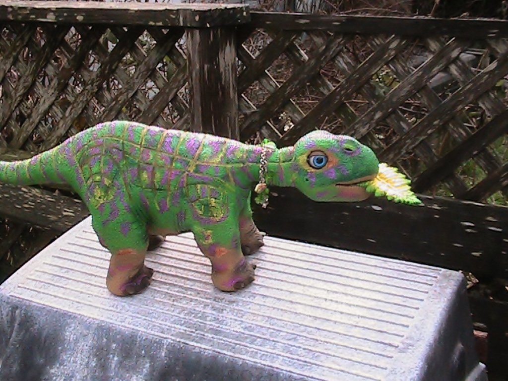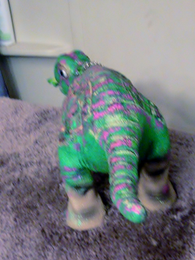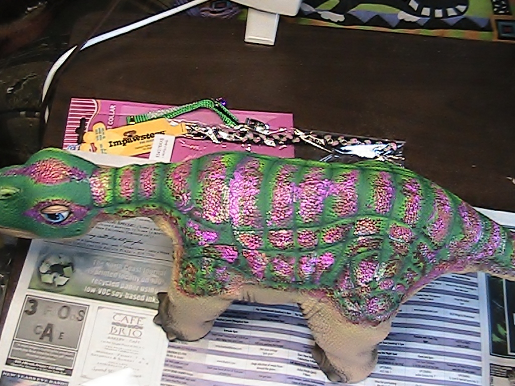 Thanks Snowy, well I started out with a plan to remove the green from the legs , but after I started a plan just hatched and "the mad Painter of the Redwoods" really took over and I had no control over my hands, it had a life and mind of  it's own, so like it or not, here is the finished creation, I am calling, "fantasy Pleo" because I do not know what else to call it. P;D P:) so let me know if it is ok or not.................