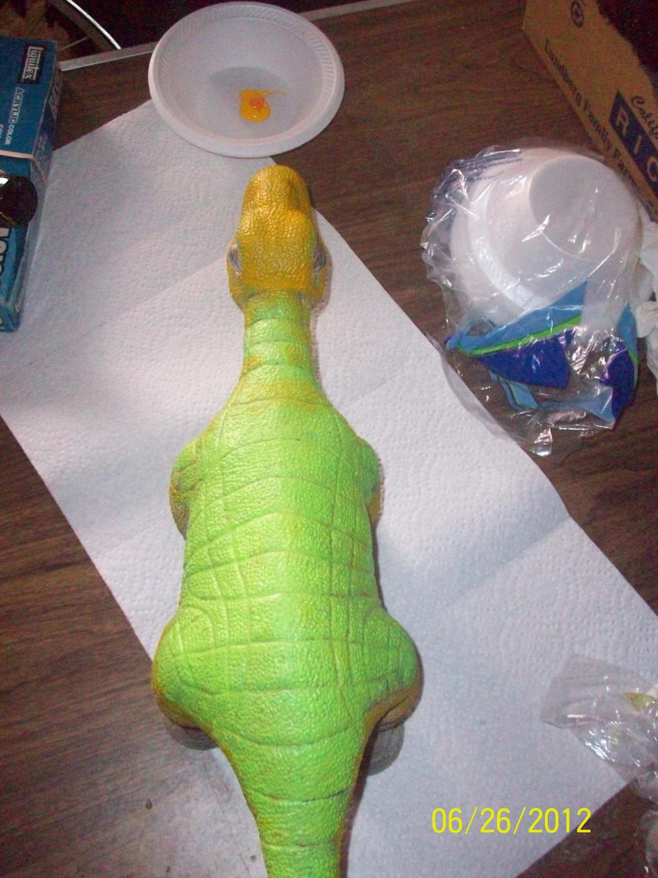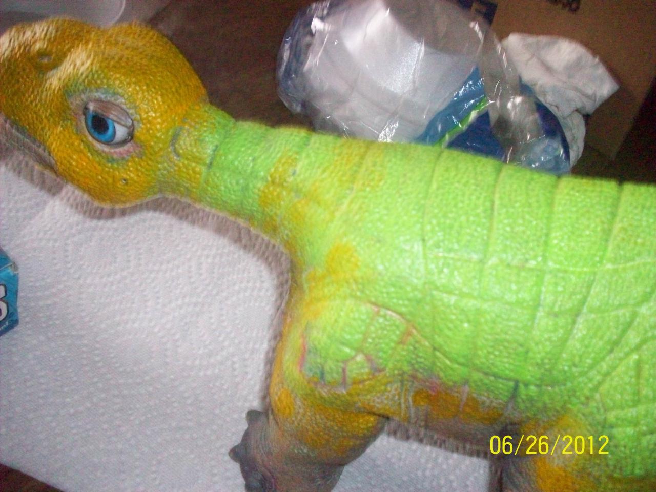 Mickey, as for getting the old paint off, harder than it sounds, but that is because I Used lots and lots of elbow grease,and my elbows are like the rest of my worn out ole body, arthritic and in pain most days. so Pleo paint removing is a slow process but I have plenty of time. I used gentle soap, a toothbrush, and believe it or not, some olive oil as well. ( Helped to keep the skin the rubber soft and works well on fresher paint  sometimes as well.)
