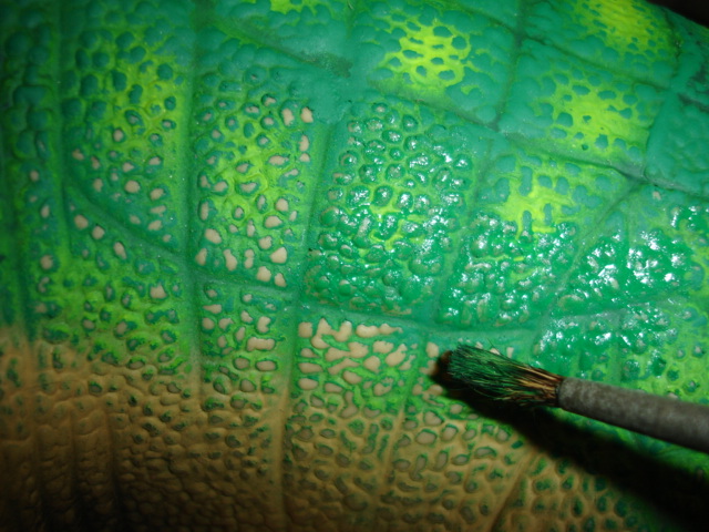 Bit of an update (as promised and sorry it took a while!) - I had a go at retouching some of the worn areas of Iggy's body.  I've given up altogether on the Sap Green acrylic ink - it looks near enough in the bottle but is in fact too much of an olive green and I get a much better colour mixing the Prussian Blue (Hue) and the Light Green.  Again, this is just the dark green layer and I'll add the lighter green tomorrow.