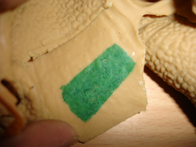 And here's the patch after stretching it in all directions and general abuse.  You can see it's lost the sheen and gone rather grainy, but on the whole it's still there and didn't rub off or separate from the skin.  I'm happy with that - stretching like that is a big ask!