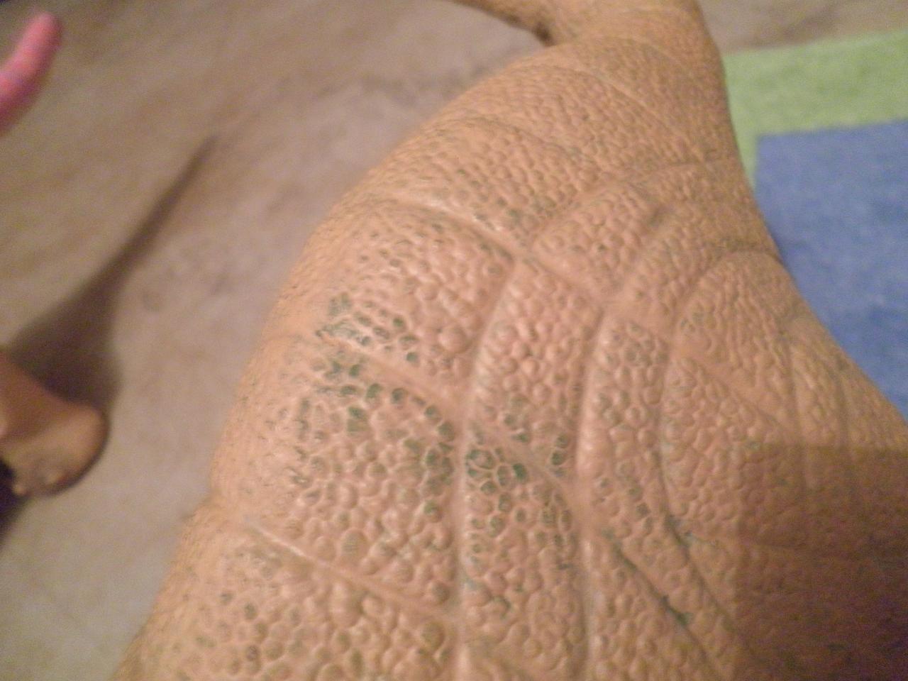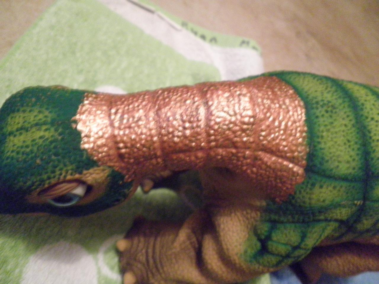 Ok so no time to waist, here is attempt number 3.  So far I have just done the neck area as this seems to be the bit that is causing me problems and I will see how it goes.  I have chosen a lovely bronze to try this time and this ink seems so much thicker than the other stuff I was using.  I have not mixed this one at all.  Just given it a good shake and stir and then spread it on Gumble straight from the bottle with a brush.  I turned him on while I was painting him and it seemed to be moving with him ok but yet again we will have to wait for it to dry before we know for sure.  This stuff covers better than the last stuff too. Although this could be due to the thickness of it.  I can still see his green through it but not too much.