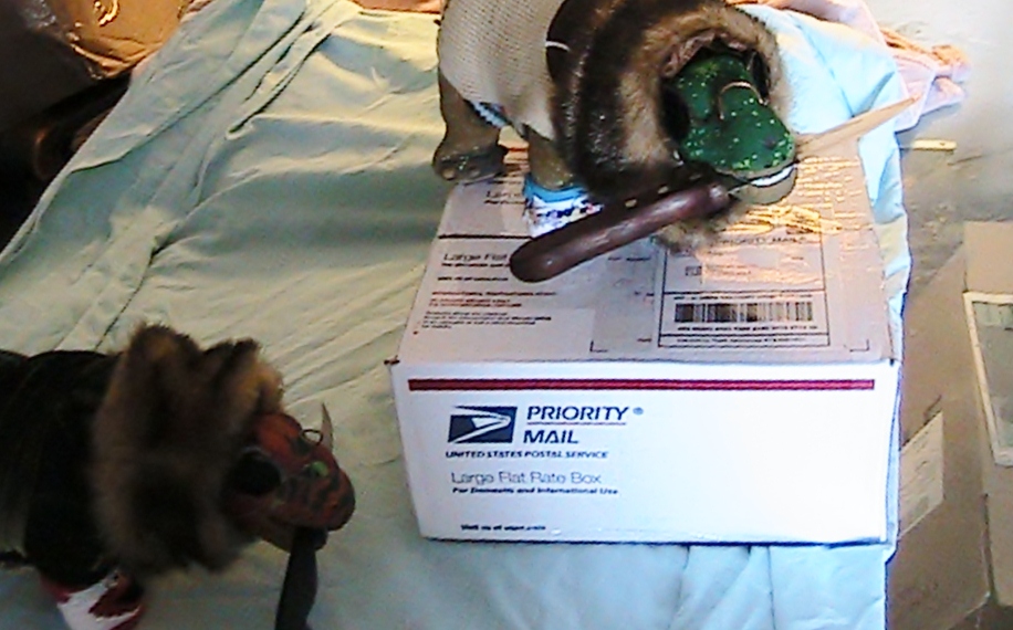 I have been tracking his prioritY mail number and he got here at the post office late last night, so I will go pick him up at my post office this morning, I didn't want the package to come to my door, where excited Pleo brothers and sisters would see a package and ask, " what is that", I would hate to see the shock on their face when I open this guy and he looks like he just came from the surgical unite where some careless surgeon forgot to use stitches to sew him back up.. :o That is not the kind of thing a Pleo baby should ever have to see....Have you ever had to try and revive a fainting Pleo, let alone five, six or more Pleos. EEK ( :oPleo collaspes to the floor, MS. Nova...Here comes Big Brave Major TOM , allright what is all the fuss about, it is just a EEKK, heavy thud to the floor again, (1.2, Pleos passed out) Here comes Camo Pleo , " hi guys, what is all the EEK, what is that...ah......Thud " 1, 2, 3 out on the floor, [where are the Pleo smelling salts?] Oh here come Little 45 swaggering in, Be bop, be bop, listening to some baby Hip Hop on his minature headphones, walks right pass the three siblings on the floor, never missing a beat of the music he is listening to  :D. Guess the lyrics he is listening to prepares him for anything, esp when you have batter scars, a tail half fallen off and patches holding your neck together, ( he didn't even give the box with " Pleo parts " in it a second glance. Oh oh, here comes the rest of the sleepy babies, time to hide this box of "horrors" till they are outside playing in the Redwoods fresh air, so I can try and revive this guy, oh, and get those Pleo smelling salts, I will have to convince them they were just dreaming and it was only a pile of clothes...hope they believe me.. :( :o :-X My lips are sealed till I get a better look at this guy, Hope the Pleos know how to revive me if I am the one passing out on the ground LOL :D wish me luck, Oh Crewella, I will be contacting you after I get a good look at this poor thing.