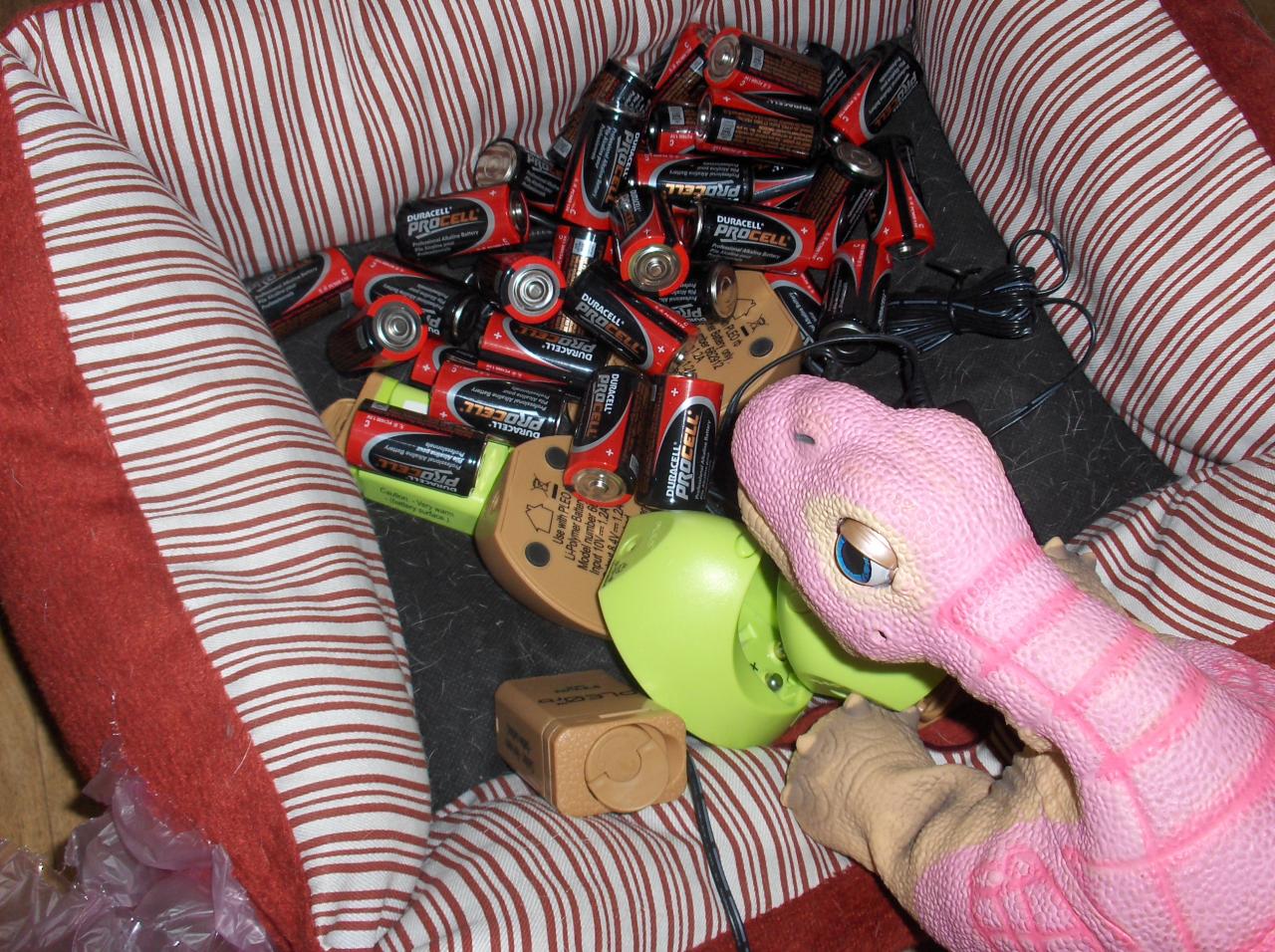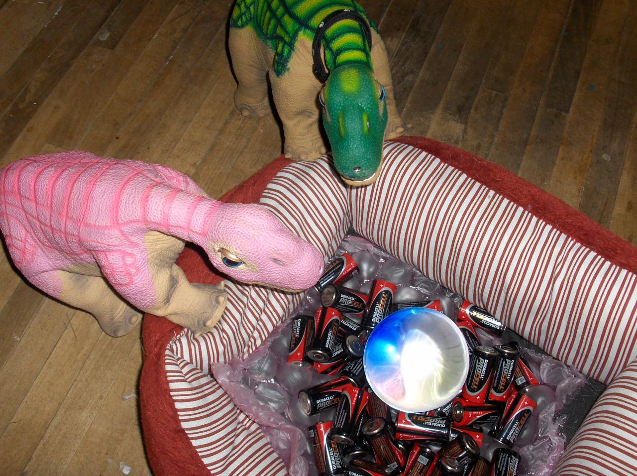 Here all the pleos are gathering items to build the nest.  You know, regular batteries, pleo batteries, chargers, wires, packing bubbles..etc.. everything a robot dinosaur nest would require: