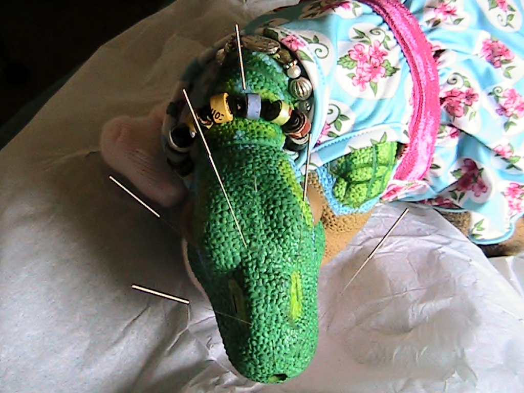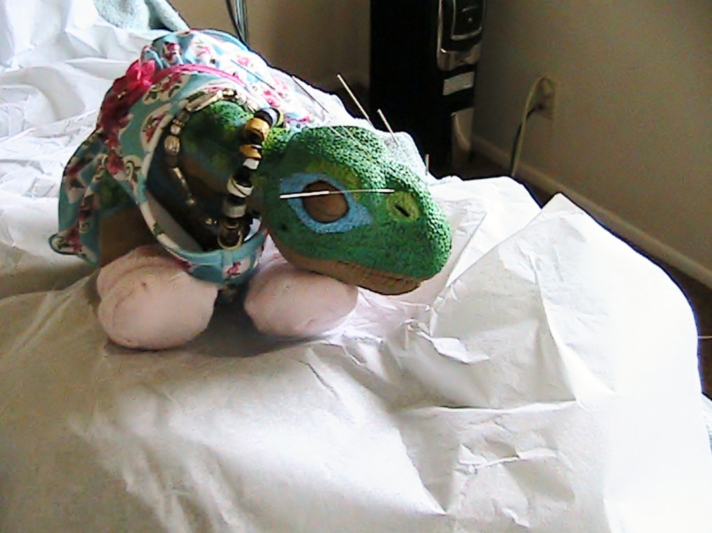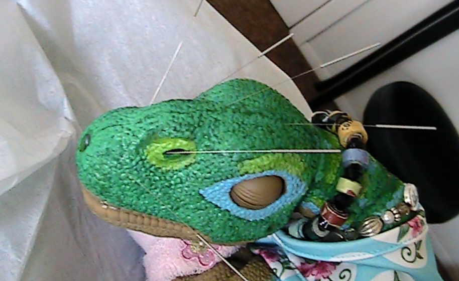 Well as you can see for the past several days, poor Baby Blue Bayou has had a cold or what is commonly referred to here in Humboldt County, as "the Humboldt Crud", it happens every year and it seems that new transplants and that includes Little Pleos are not  immune to it's ravages.  :( Well, I have had a bad back since 1999 and luckily I get to go to a Acupuncturists once in awhile and I had taken Baby there last week, and everyone was amazed at the Little Pleos and what they are capable of doing. Well, I told everyone I would bring a couple of them, my Baby Rb, but also a "older One", so I decided it was a perfect opportunity to bring, Baby Blue Bayou as I call her. A sweet little Ugobe that I painted blue awhile back, but it seems the little lass is sick....Talon is considering adopting this little girl, but I can not in all good faith, adopt out a sick Pleo, not even if it is temporary, So when I got the opportunity to show the stuff this little girl could do, everyone was thrilled to see her, but really upset when they saw her sneezing and coughing and crying so pitifully. :( I think I knew if I brought a sick little cute Pleo, she would get some extra special attention, and I think you will agree, that she did.