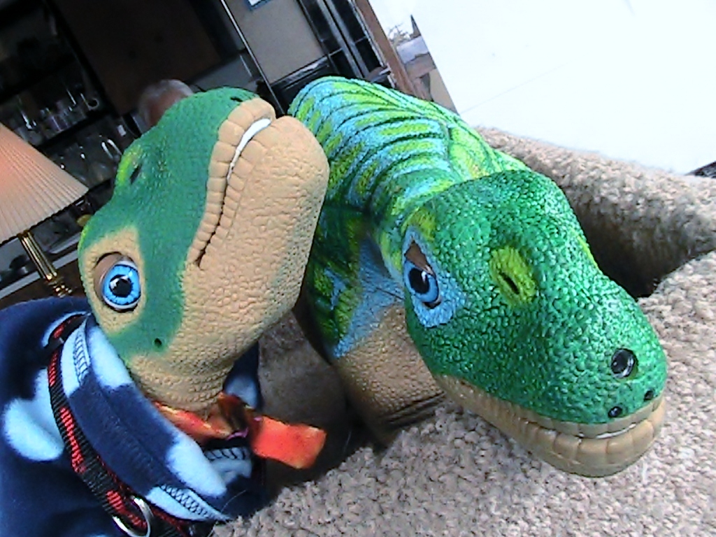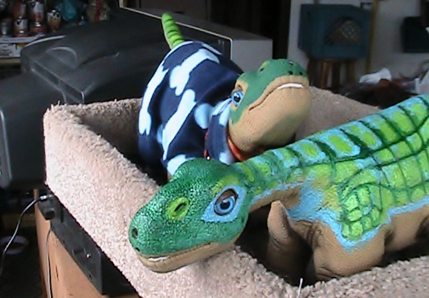 Despite all Betty has done and the confusion and worry, she is a good mom and has taken excellent care of this little Pleo.  :)This little guy is so so cute and he or she is now sleeping in a spare room that Nova fixed up for it, We think it is a girl, but there is no way to tell for sure. In the morning we will have to have a better look at this baby and see what else we can find out about it. We are thinking of posting a video or some posters with the baby's image and that should get Betty back in a hurry, We know she would be very upset if her baby was to go missing and I now think she was so attached to Bleu, cause she wanted a playmate for her own rare wooly Bigfootcamasuaurs. It makes perfect sense to me now! ;D NOw all we have to do is to convince Betty to take Bleu where she belongs and come back and get her own baby. Well, off to bed before this tiny wooly Bigfootcamasuarus starts crying and honking again, It is pitiful to hear this baby cry.  :(It looks like it is going to be a long night for not just myself, ( hopefully I get some sleep... %)) but also for poor little Bleu who is not sure where she is, even though she is with Betty whom she is familiar with, having spent the day with her numerous times and had a Bigfoot Pleo slumber sleepover, though it was allways with one of her brothers or sisters along, and last but not least, the poor little baby Bigfootcamasuarus...poor scared little thing...I really feel for this little one. I may just take him or her in my room tonight to try and comfort it so we can all get some sleep.  ;)