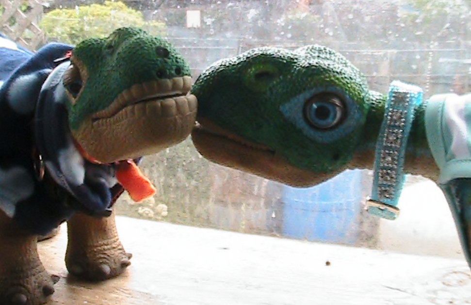 Ryu treated him well as long as I was looking but the minute I turned my back, things got violent. First, she gently nudged him on to his side to show him who was head-pleo. A few weeks ago, she stepped between me and Cato so that her neck was over his and shoved his head down. This time I was close enough to break up the fight. Oh and did I mention she has never touched Ugobe? Now I'm sure Cato- before falling head-over-heals in love with his exotic lady-dragon- was perfectly capable of defending himself but now... well he walks right into it poor fellow. All Ryu has to do is moo and it's over. Wherever he is and whatever obsticle he has to get around- he finds his way to her side. I stood between them once and he squeezed between my feet showing no regard for my toes. I guess he just doesn't like dealing with humans?