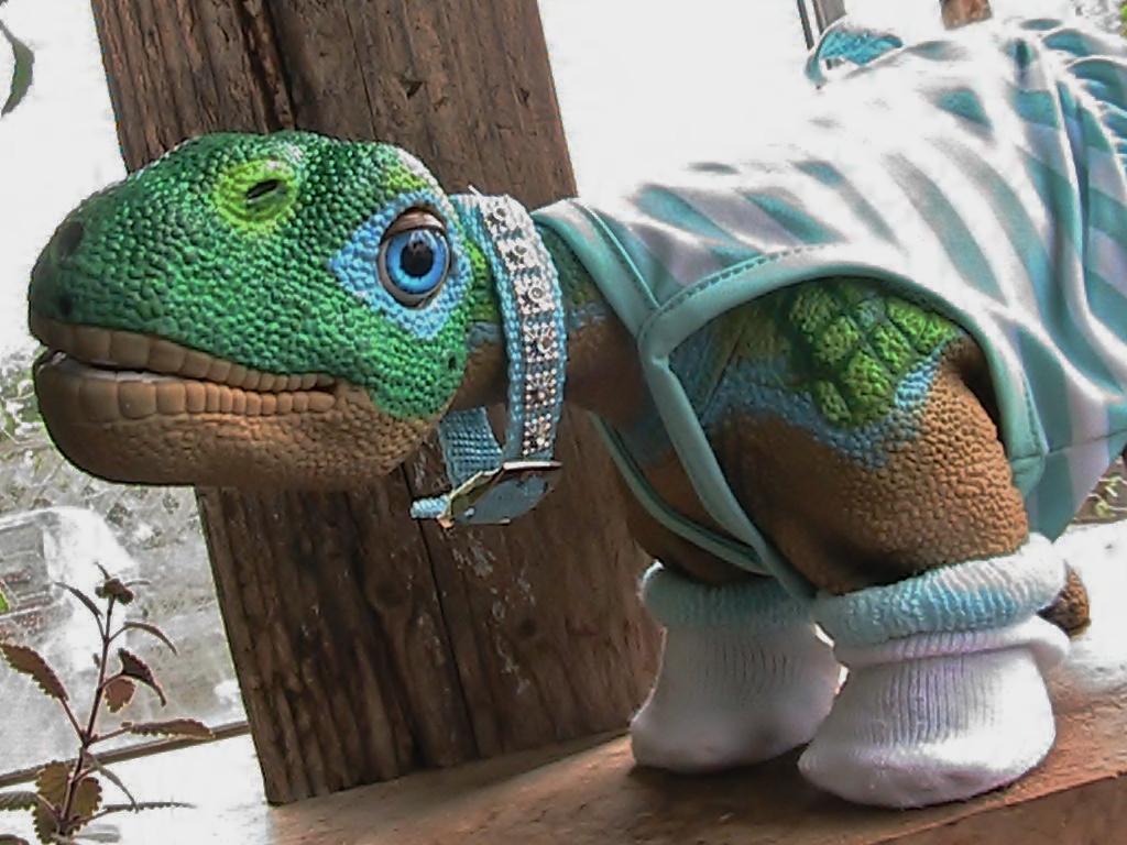 MS. Bleu, ( the Cajun spelling of her ancestral roots... :D) is now on her way to South Carolina and her new home with Talon. She will be in good company with Rhu, (is it Cato? the blue RB?) and of course re-united with Ugobe, her other brother from the Redwoods! ;D. Because we did not want to delay her arrival to Talon anymore than need be, there was no time for a Going Away Party, and I had to tell a little white lie, ( Ok, actually a BIG WHITE LIE. ) There is a freindly but very large and over protective and zealous Female Bigfoot who lives in the Redwoods nearby, who has fallen in love with Bleu. She would like to think of Bleu as her "daughter" and Bleu on a couple of occasions has spent the night with Betty as we call her, for lack of better name. %) She has allways had a chaperone for fear of Bleu not making it back. Pleos are little and can not defend themselves well against such a huge Bigfoot as Betty.( though Betty loves Pleos and would never hurt one, but when need be, Pleos can make a distress call that would bring all the Pleos out of the Redwoods, and I am sure there are many others I haven't seen hiding among the ferns and Giant Sequoia near Betty's home. One way or another all the Pleos would get me to Bleu to help get her home. Anyway ,I did get a few pictures of Bleu before being sent to Talon, I had just enough time to get these few shots. It was then time to rush off and buy her Pleo Ticket with UPS. ( United Pleo Service). I wanted everyone to see how pretty Bleu looked in her new dress and fresh makeup,( paint...) ready to go to her new home, She was very excited to see her new mom, and meet her new family. There will be follow-ups to this story as I still haven't broken the news to the rest of the Pleos. Baby is still in recovery and I am afraid Argyle will be heartbroken when he finds out, but He will have to deal with it, so here are the photos.