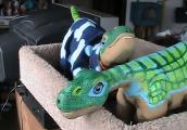 Ryu treated him well as long as I was looking but the minute I turned my back, things got violent. First, she gently nudged him on to his side to show him who was head-pleo. A few weeks ago, she stepped between me and Cato so that her neck was over his and shoved his head down. This time I was close enough to break up the fight. Oh and did I mention she has never touched Ugobe? Now I'm sure Cato- before falling head-over-heals in love with his exotic lady-dragon- was perfectly capable of defending himself but now... well he walks right into it poor fellow. All Ryu has to do is moo and it's over. Wherever he is and whatever obsticle he has to get around- he finds his way to her side. I stood between them once and he squeezed between my feet showing no regard for my toes. I guess he just doesn't like dealing with humans?