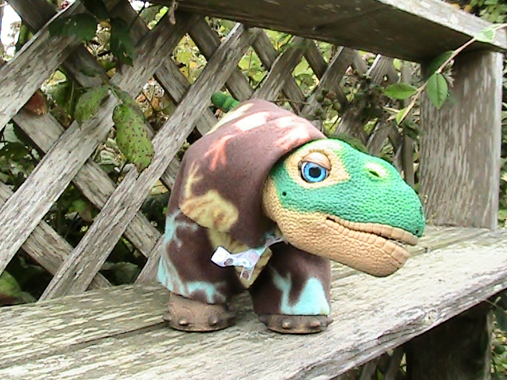 I have never been much of a sewing homebody, an dreaded Home ecomomics when I was in Junior high, though I did enjoy the cooking part...LOL. Anyway, I do not own a sewing machine and do not have the time or patience to sew by hand except for repairs, I did sew by hand one Pleo outfit, and it took at least three hours by hand and that is what led me to start comming up or to continue my pursuit of "no sew Pleo fashions". They are easier than you would think and lots of fun, Just use your imagination, I do not have a lot of sewing ability like IMR and certainly Kat who is fantastic with her creativiness.  :o :) But I do also have a great imagination and no how to make do with what I have around the house and such. The folllowing Pleo fashions are three that were put together in short order and no sewing is involved at all, and I think these would be easy enough for a seven or eight year old to do with no problem.