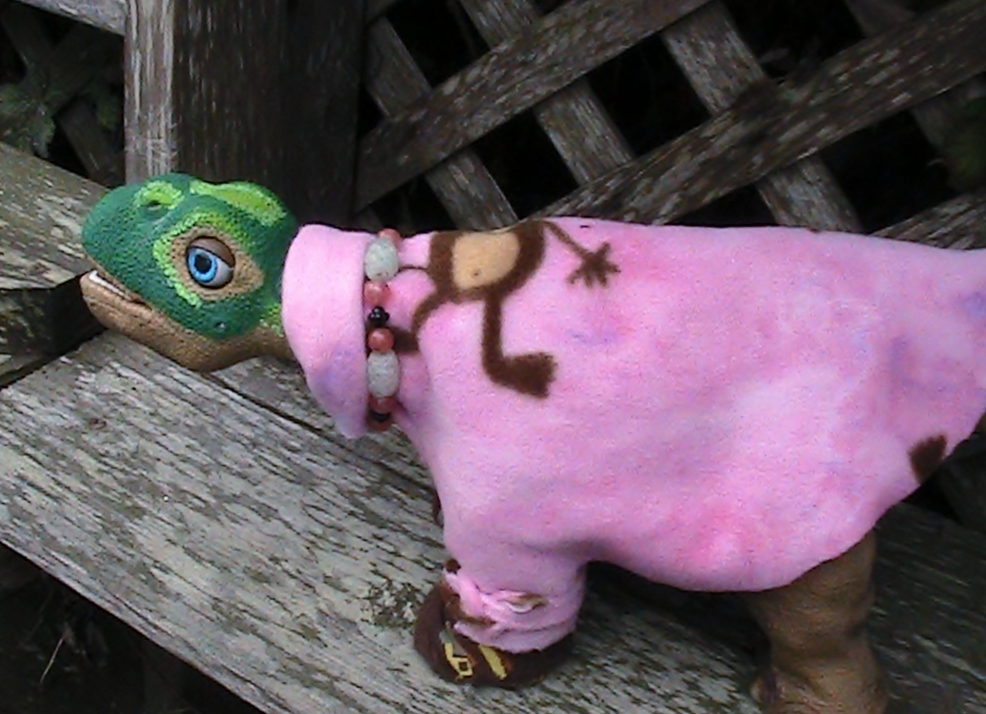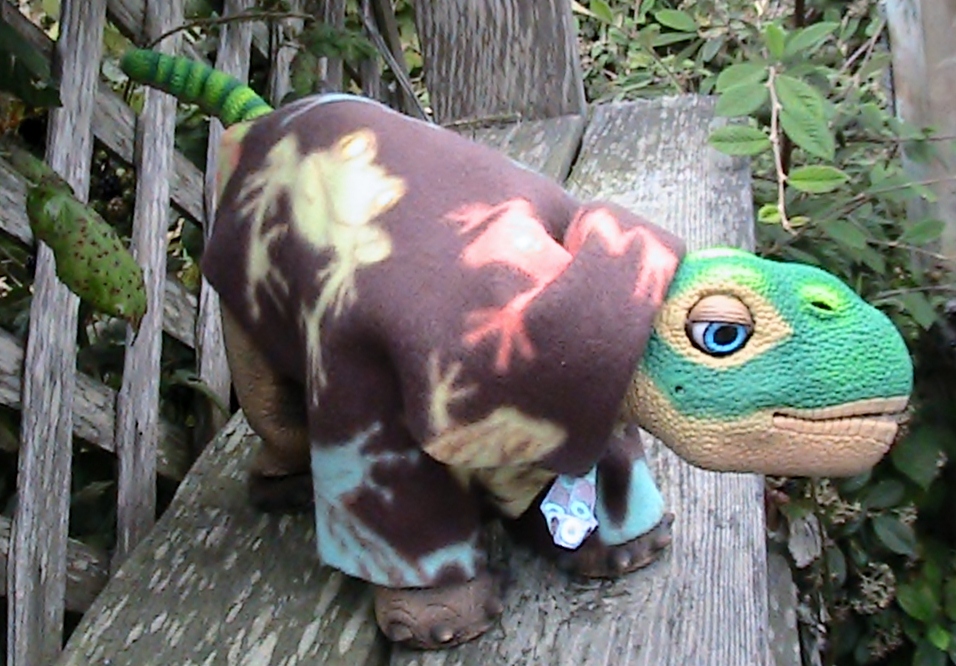 I realized it has been a long time since I posted new and updated photos of more "no sew" pleo outfits, so this is a good opportunity to add a few more while the mood strikes. So here in the spirit of those of us, ( unlike Kat or IMR who are very talented in the sewing department.. ;D)  so here are some of the newest "no sew" creations but not all of them. Just goes to show you can use anything around the house and of course, your imagination.