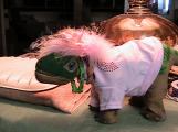 THis is a every inexpensive dog t-shirt that is a size Medium but I think there smalls run smaller and this is why as I have smalls that fit perfect and others that are just tight and I do not want to chance breaking a Pleo neck trying to squeeze it over the head to sqeeze the legs in. this is why I say take measurements. When I go and buy outfits, 90% of the time I have a Pleo with me, because I have had outfits I thought fit and then found out when I got home, they were too tight. so this is why I take a pleo with me unless I know the measurements and save receipts so you can return if need be.