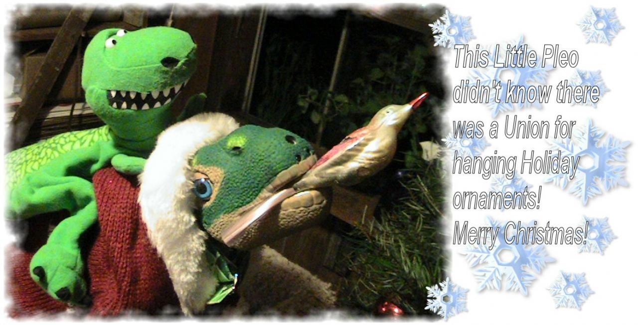 It is supposed to say: This little Pleo didn't know there was a union for hanging Holiday ornaments on the tree! Merry Christmas!                I am not good at Photoshop, and was trying to edit the text there, but thought I would let it just be this way for now.                       I have more to do, this is just to get me going. This is a photo I took of Major Tom last year with help hanging an ornament on the tree and thought it was funny!                                   RWM and the Pleo township of the redwoods.