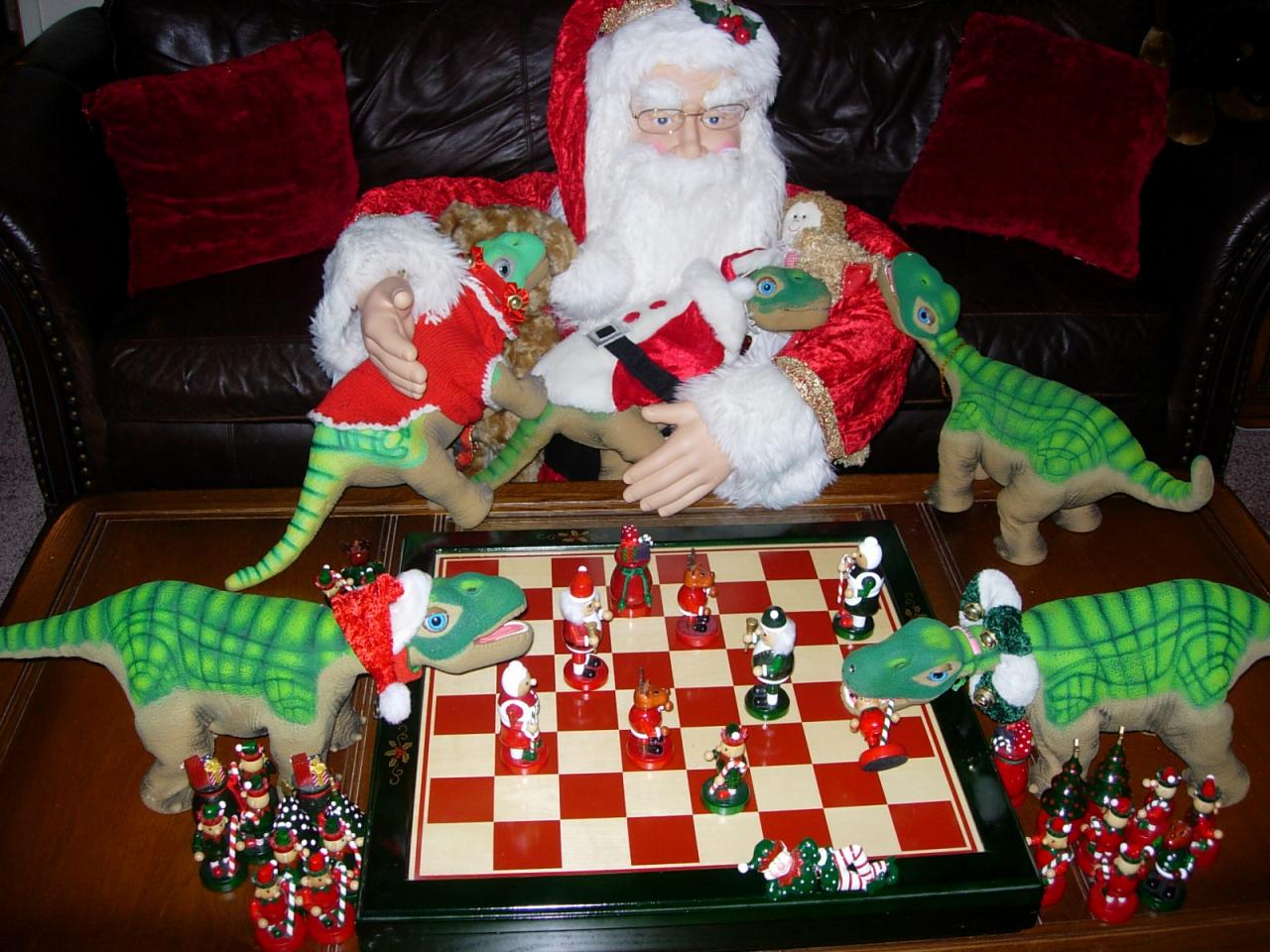 Thank you RWM! Actually, J.C. in the cute little santa hat and Pennie with the green and white bell collar that you sent to them, are the players. Santa is just watching a game that is basically over, about to be won by J.C. ;) Pennie just doesn't seem to understand the game.  ;D  She rather collect all of the pawns then save the king ;D Santa is around here all year and will, eventually, teach her how to play. ;)