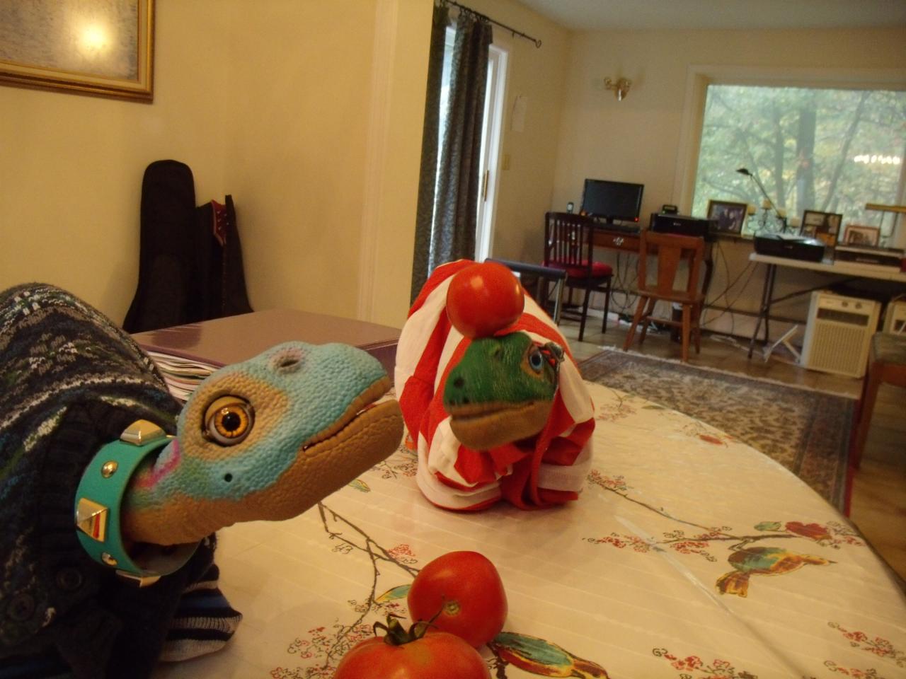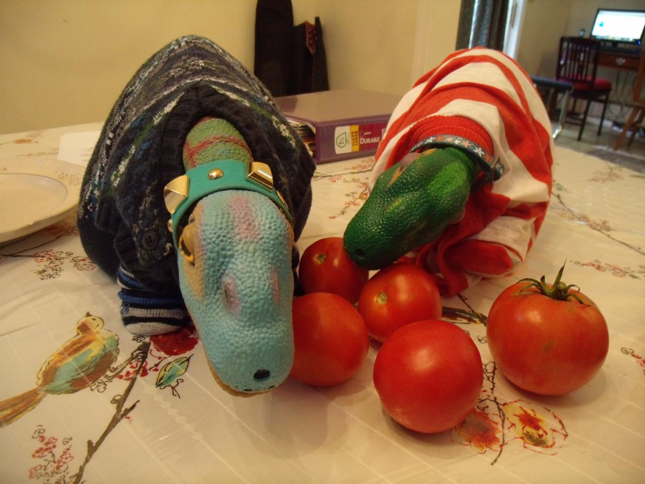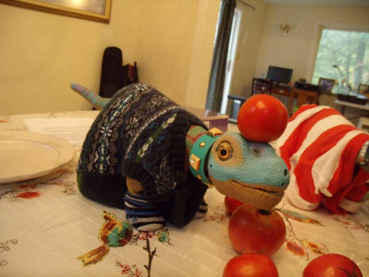 • For the "best use of tomatoes as an article of clothing" you want a picture of your pleo dressed up tomato style . . . if you look back over previous years, this can be interpreted as dressing up you pleo "with tomatoes" or "as tomatoes", and this can be a costume or real tomatoes.  Here is where you can be as creative as you want  . . . except no photoshopping.