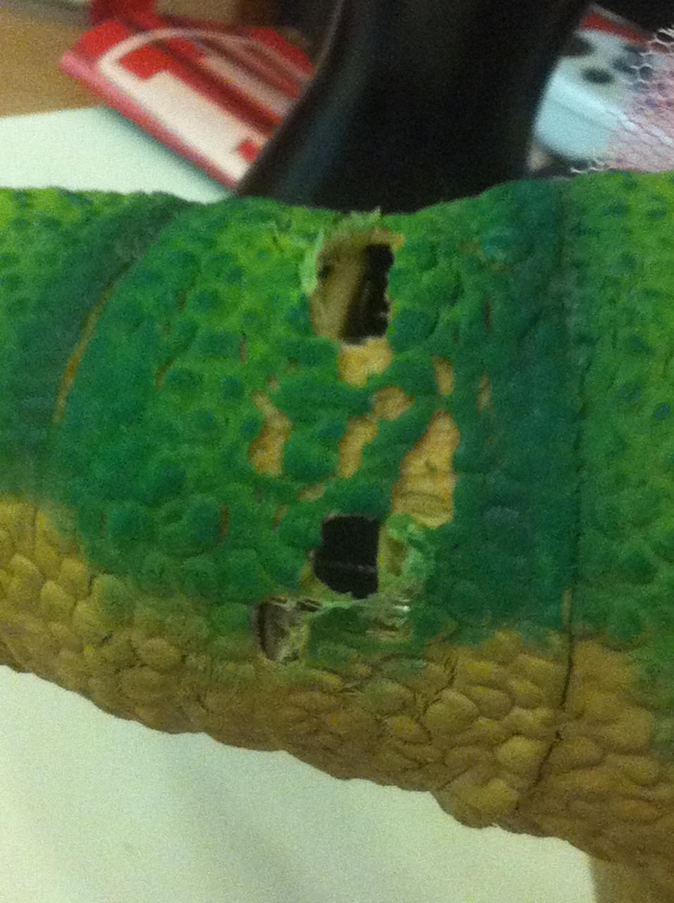 just tried bostik super glue, the basic one, it did stick the hole together, i left it 12 hours, then i switched pleo on, and the hole opened up again. pleo says "Grrrrrr"... :D