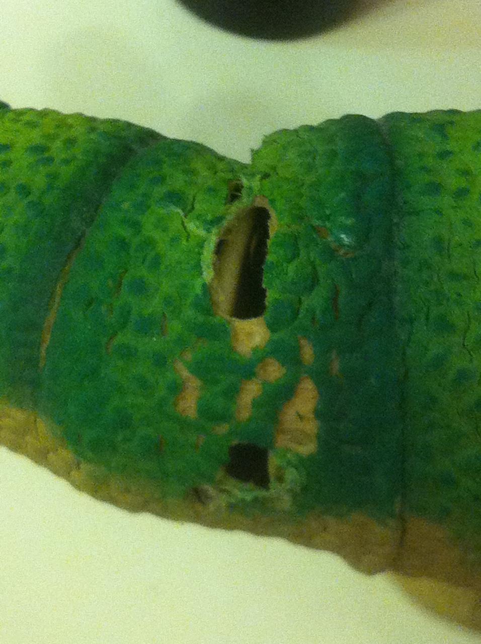 Hi Snowy, wow those are big holes a lot like Little 45 who I repaired. As for the Superglue that I used on him and other Pleos, neck cuts, you can have a package of supeglue for free, just would have to pay for the postage. I wonder can you give me some rough dimensions of skin and is the skin around it degraded pretty bad, very dry. If so , you may have to use more than superglue as I did with Little 45 and I think I did a video a long time ago that showed his holes, similiiar and how I repaired it. Let me know about his skin and holes Snowy.                             RWM