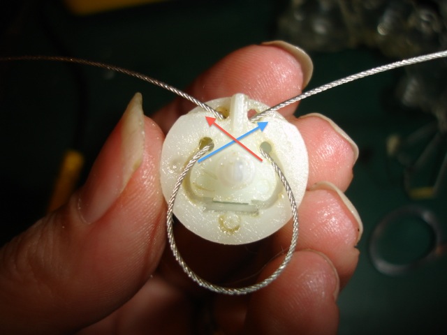 Edit: sorry its a bit crude, the blue is the cable, the red is where the copper tab, or whatever your substitute was, sits, the black is the gear and the purple represents the little white tabs that the cables run through as it exits the clear plastic gear housing. The cables come out the top and wrap back around the gear, but they mustn't cross over.