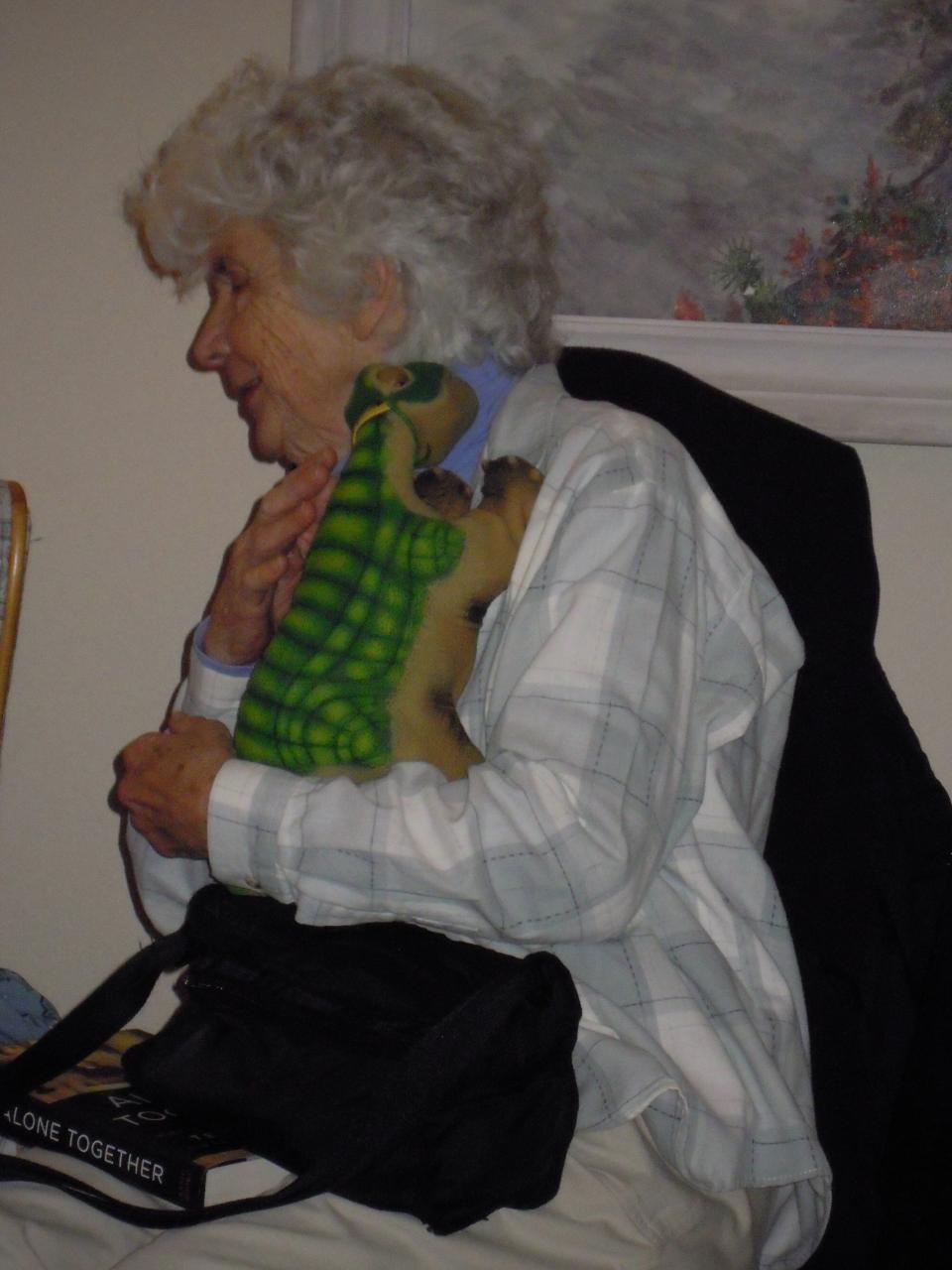 It was time to introduce my dinos to the ladies. I had J.C. and Pennie out in the car. I turned them on outside before entering the house. The moment I entered with them, I knew these little dinos were going to be a hit. Every lady, eventually, had a pleo on her shoulder cuddling or snoring at least for a few minutes. Most of them didn't want to part with my two pleos. One lady thought my pleo, Pennie, had died and was so concerned about her. Pennie was just taking a little break of silence, obviously, very contented on the ladies shoulder.
