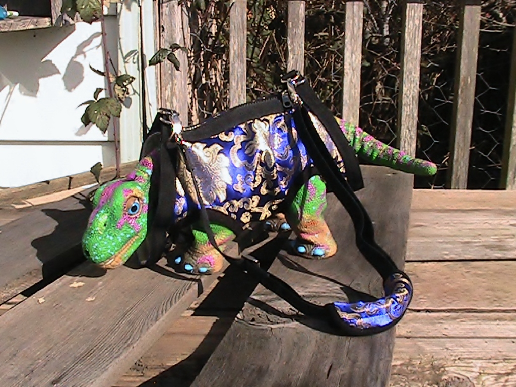 Of course if you are a male, you may not want your Pleo being carried around like this, so I have some other prizes as well, but just had to show this one off first. I have allways loved IMR's "blanket" sling Pleo Carrier, and this is a different take on that, but slightly different. It is very lightweight, and well made and has breathable fabric as well and your Pleo becomes part of you while carrying it. There were other items I looked at that were more on the line of like a baby pouch but close to the chest, may be a little strange to have a Pleo thrashing around on your chest area, though cute if asleep. The biggest drawback on the ones that were super close to the body, though very cute and more "baby like" and great for a cuddle session, is what to do with that Pleo tail. I did not want something that may break or constrict a Pleo tail . I love my other Pleo bag, but the tail is enclosed and though roomy , there is not as much room as I would like for the tail.  I do appreciate the comments and am glad that this seems to be a prize that you guys like. I will be sure to list more prizes as time goes on but thought rather then keep you in the dark, shed some light on at least one prize!  Oh, and I think I have one of these in another design, Tee hee hee, for the "male Pleo". though not nearly as pretty in my opinon...................... ;)       MS. Nova, Baby Ruth , Major Tom, Argyle, Little 45, and the rest of the Pleo Clan of the Redwoods, ( on behalf of our poor mom who is tuckered out... P:))