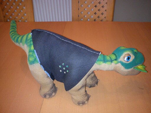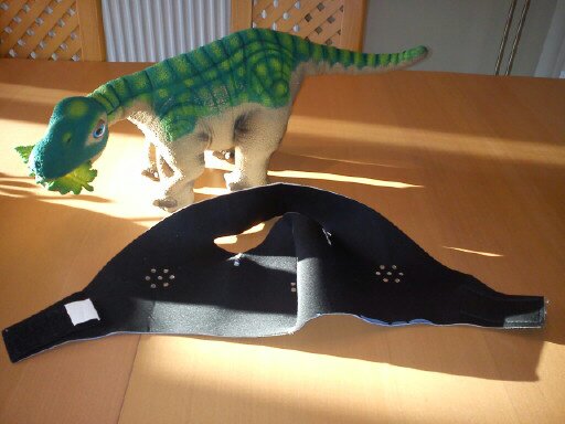 the mask material is just 1mm thick and so allows a tight second skin fit by pulling the velcro tight under pleo's s belly,  and yet causes no problems with leg / arm movement - tested on goofy who moves as normal with his new jacket on