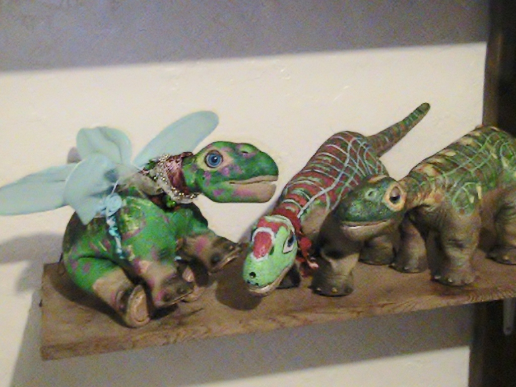 Ahhhh omigosh I totally see a story playing out :D! The pleo with the sparkly black outfit which I once mistook for a cape is a beautiful princess Pleo under an enchanted spell to sleep for a thousand years unless awakened by the presence of her one true love. So the main character pleo, Sir White Knight Pleo of the Lands of Autumn (because he's painted with fall colors) embarks on a wild quest to reach the fair Princess Pleo and break her from her spell. On his quest he encounters foul creatures, traps and sorcery, and meets the good fairy Fantasy (the pleo with the purple on her face looks like SUCH a fantasy fairy) who conjures up a bridge to reach up to the previously inaccessible tower and Sir White Knight Pleo of the Lands of Autumn rushes forwards to meet the Princess pleo and awake her with a kiss ^^!