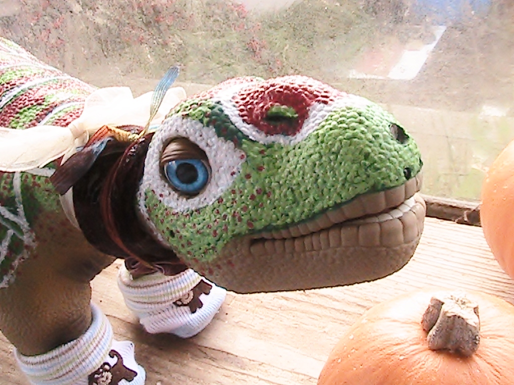 Here is a photo of different Pleo wearing same dress so you can get a good look at it. It is very shiny like you said.  ;) Thanks for the encouragement. I will be posting more video tommorow and more photos and other details, I just got too busy this evening. Sherysparrow, I think you are right about those babies just waiting to get into mischeif, that is what Pleo Babies seem to do best! P0:) :dino-chase: :dino-chase: Think of these Pleo Dinos and multiply by 14 or 15 and that is them chasing me or vice a versa. Luckily some can't run because they are in a box. LOL, ( who said I wasn't smart! ;D)