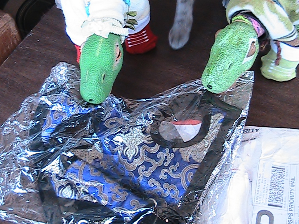 Everyone is doing great with those names, and thanks Wicked for the comments and I love the fantasy Pleo names as well, Yes, the Pleo's tail will have no problem in this bad, no tightness and lots of room both in the head area as you can see and the tail as well. When I saw this with the spots for feet and that both head and tail had ample room to "stick" out, I knew it was just the "ticket" I had to have for this competition. I love the beautiful blue oriental pattern as well.
